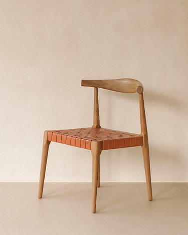 Cadeira em madeira natural com assento disponível em castanho, preto ou natural. O encosto ligeiramente curvado garante conforto, enquanto as pernas afuniladas reforçam a estética clássica e intemporal.