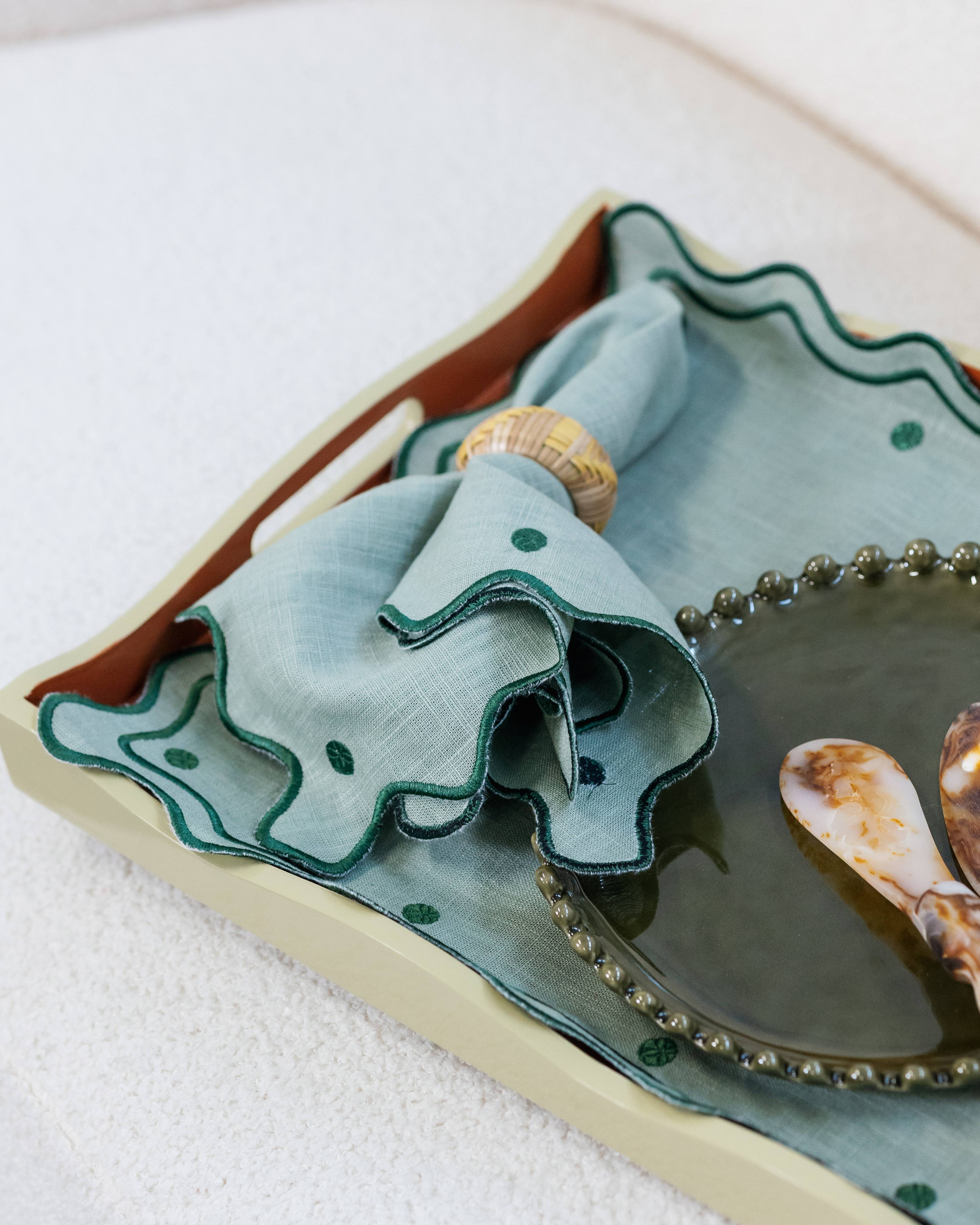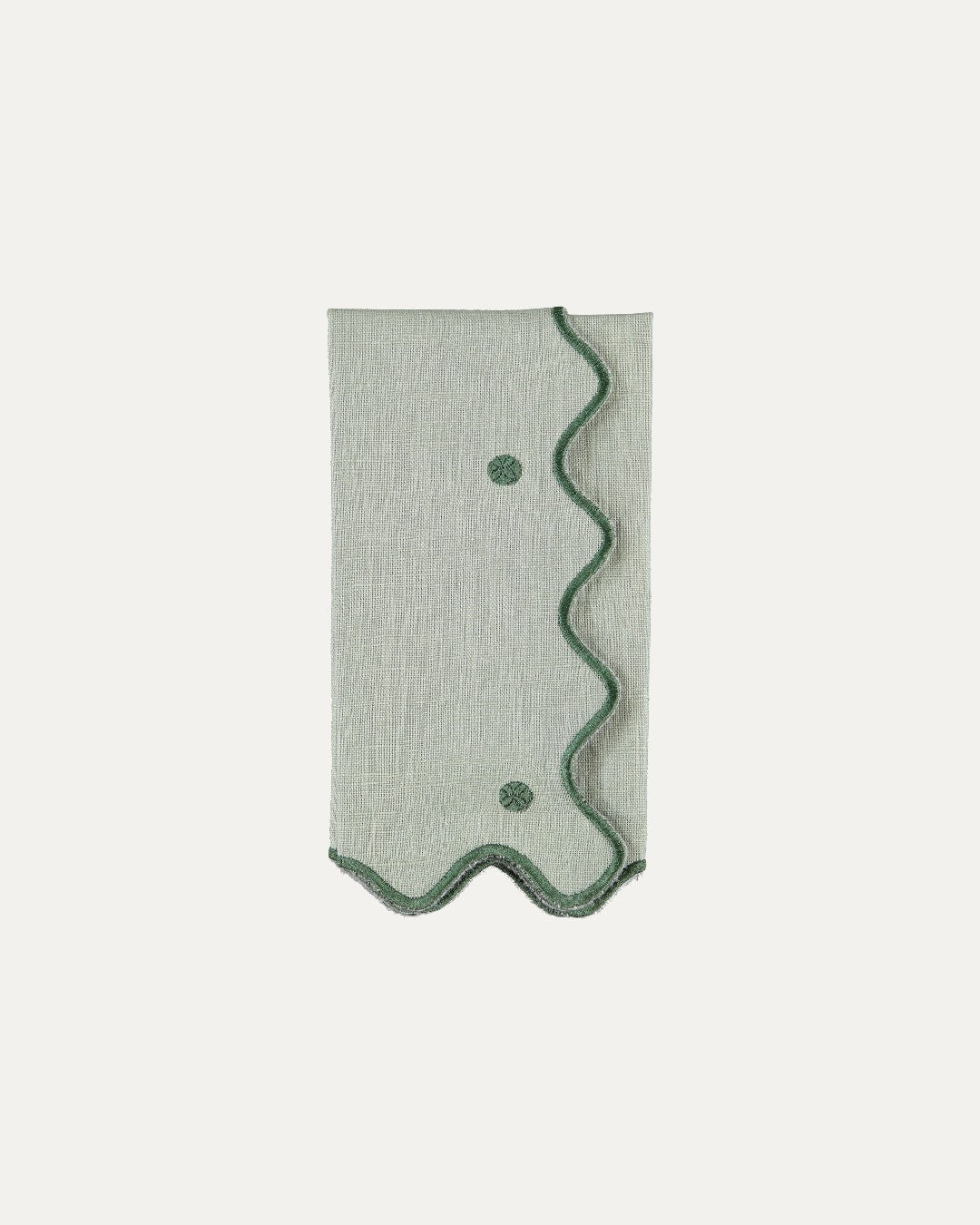 Guardanapo confeccionado em linho e algodão com borda ondulada dupla e bordado decorativo.