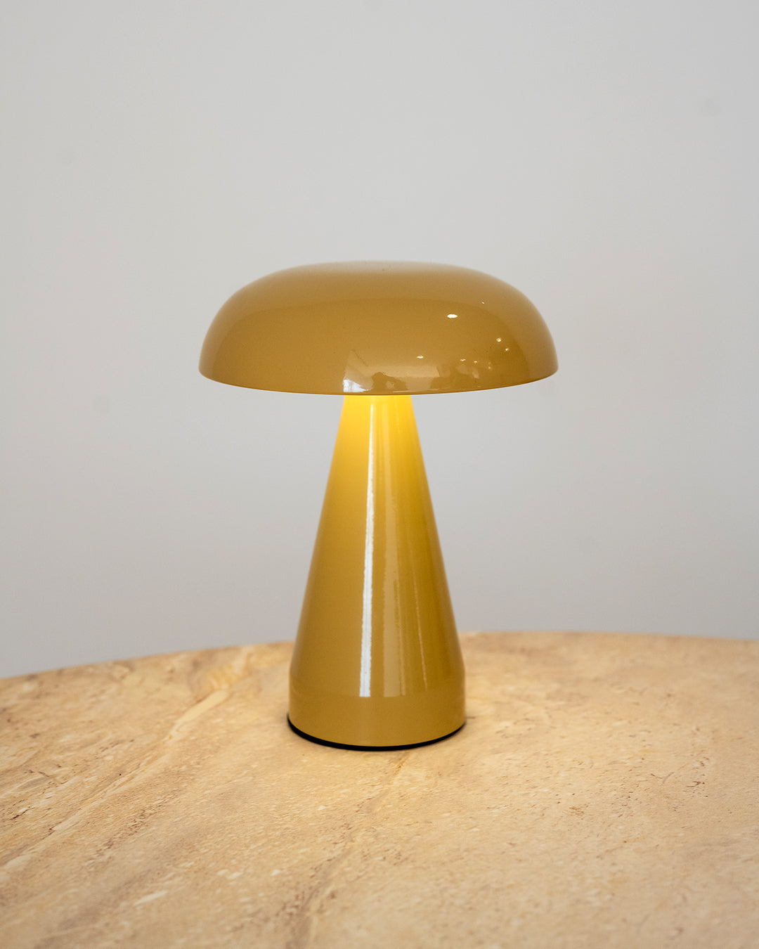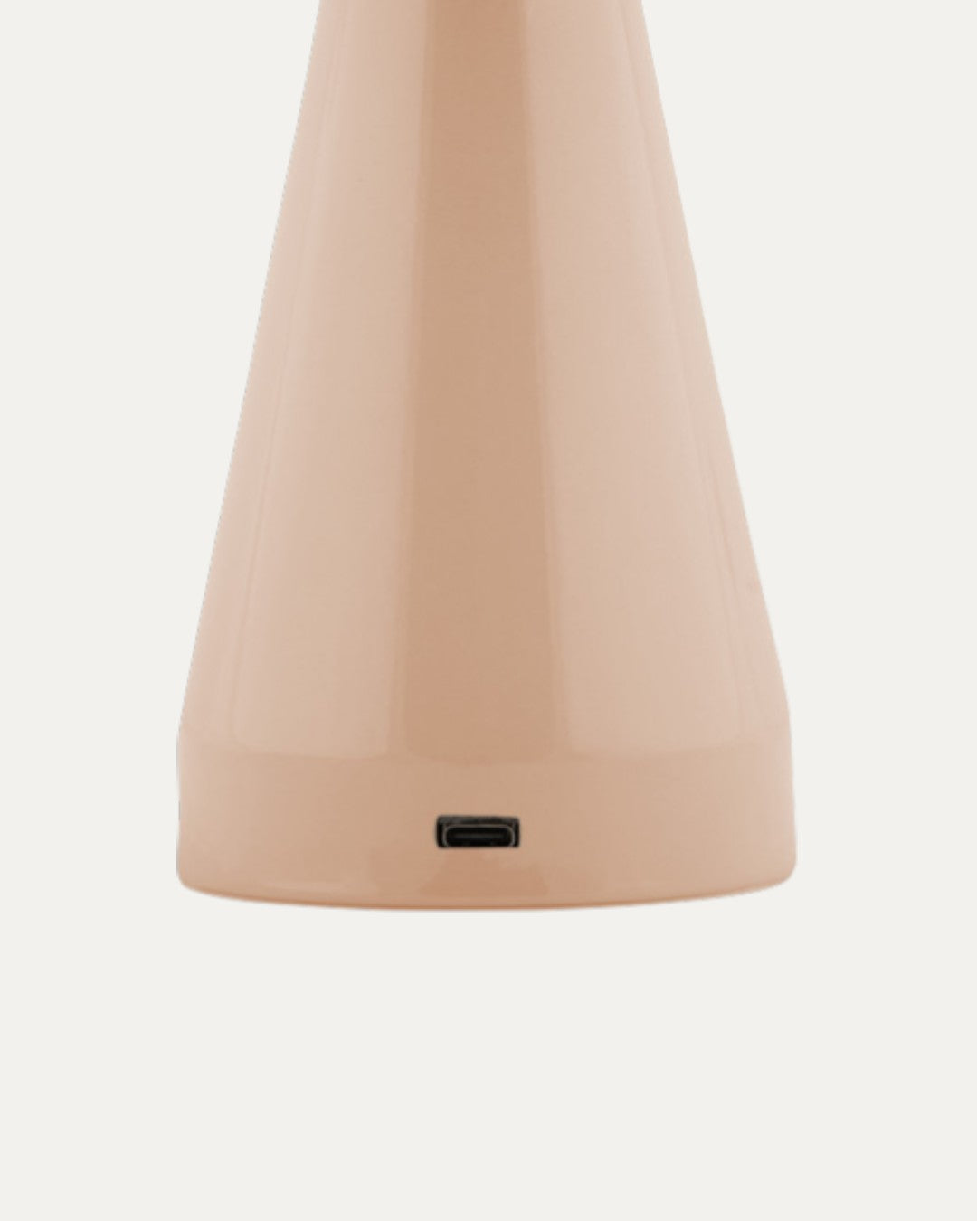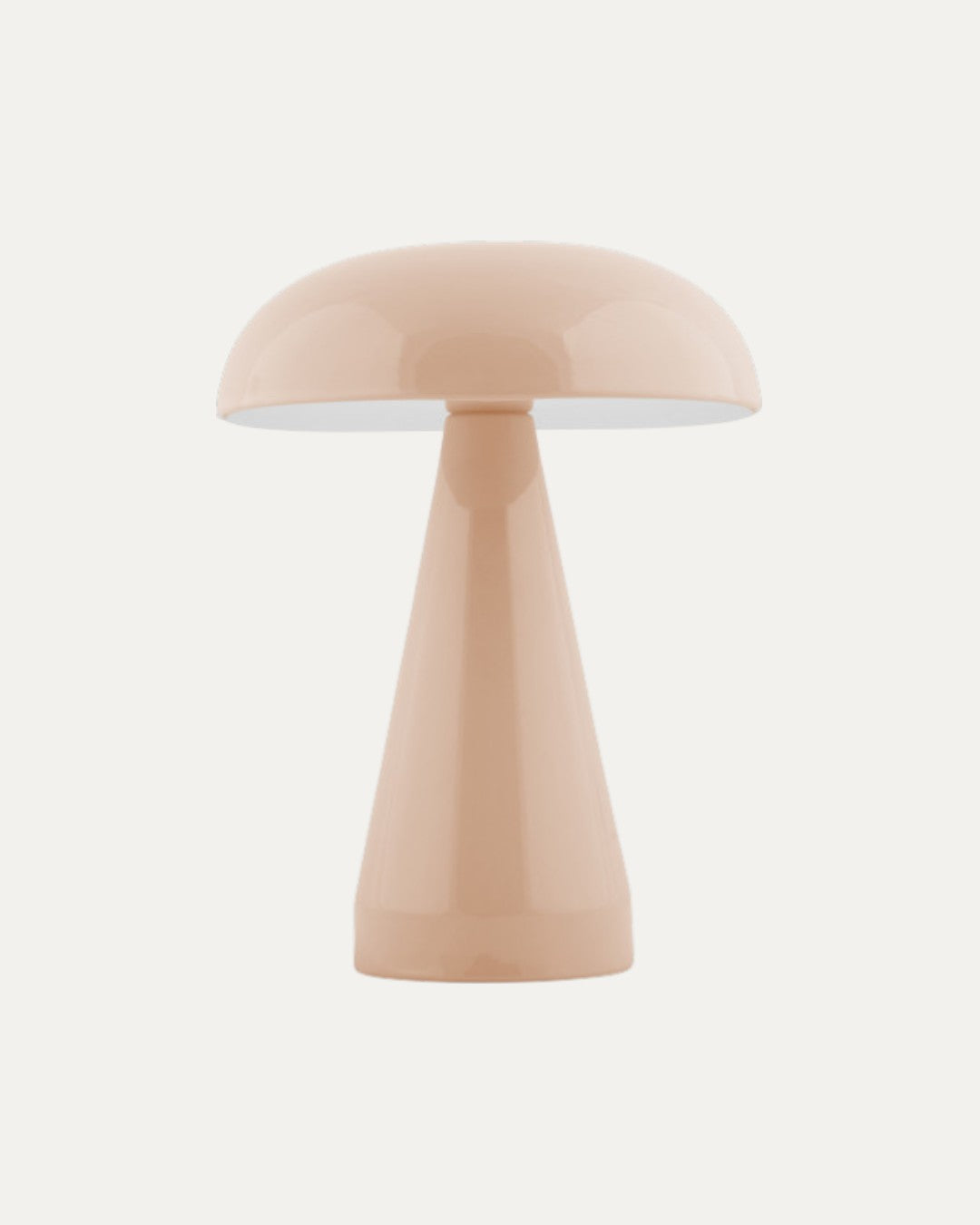 Candeeiro de mesa portátil e recarregável com acabamento de alto brilho em tom bege. Design moderno de estrutura leve com abajur convexo. Funciona sem fios, permitindo uma utilização versátil em espaços interiores e exteriores.