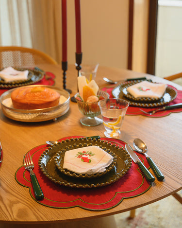 Individual redondo com recorte em forma de pétalas e duplo rebordo contrastante. Produzido em mistura de linho e algodão, combina textura natural com acabamento cuidado, ideal para mesas que valorizam o detalhe e a cor.