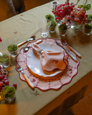 Este individual apresenta formato redondo com rebordo ondulado e bordado contrastante. Fabricado em tecido de mistura de linho e algodão, combina resistência e elegância, ideal para uso diário ou ocasiões especiais.