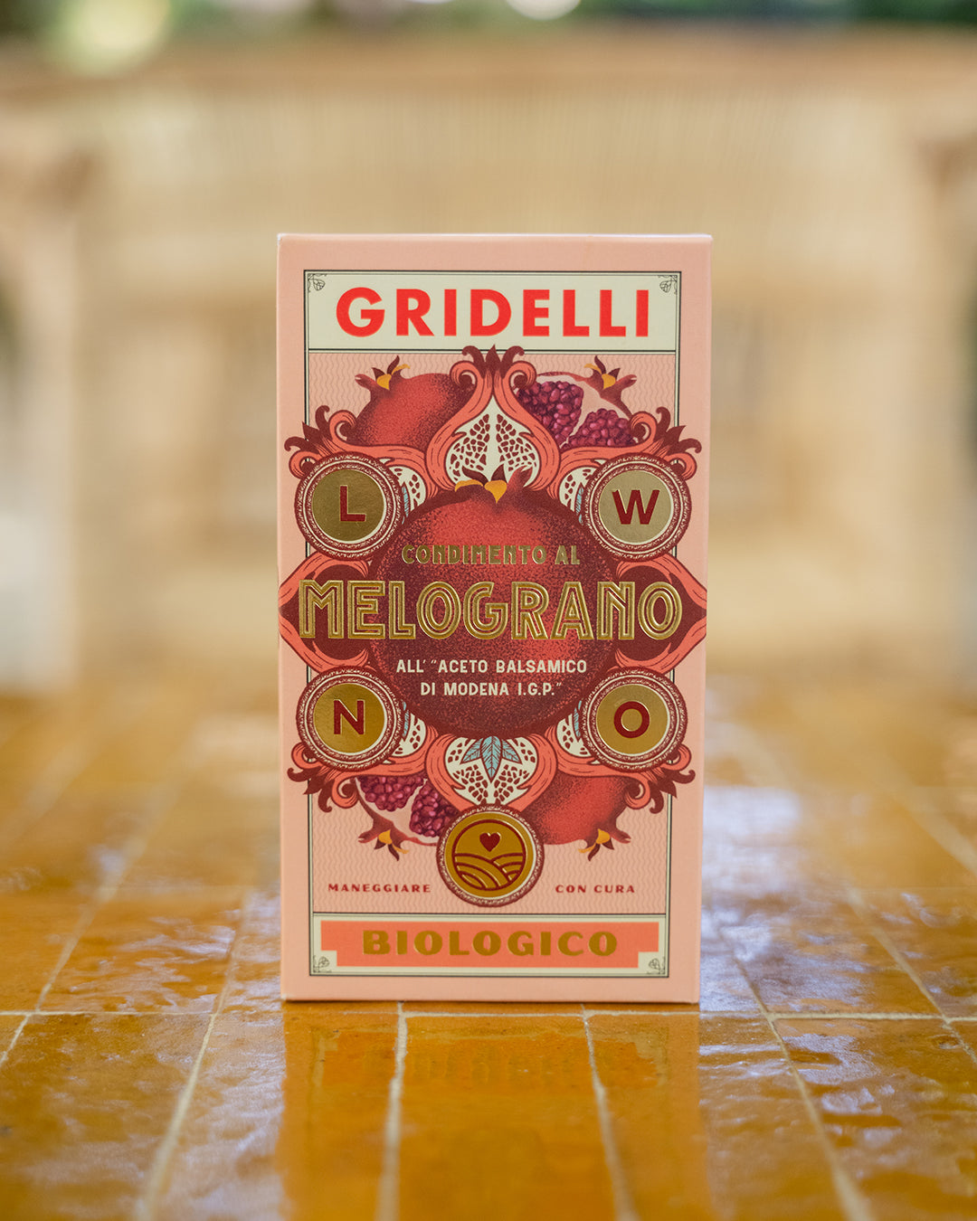 Produced from organic grapes from Emilia-Romagna, this balsamic vinegar contains 95.8% balsamic vinegar of Modena with I.G.P. certification, organic pomegranate juice, and natural flavors.