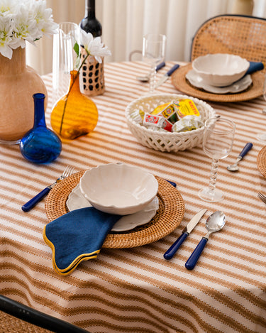 Com bordados ondulados contrastantes, estas peças destacam-se pelo design alegre e sofisticado, perfeitas para dar personalidade à mesa. Disponíveis em várias combinações de cores, permitem misturar e combinar para criar diferentes ambientes, desde ocasiões descontraídas até jantares mais formais.
