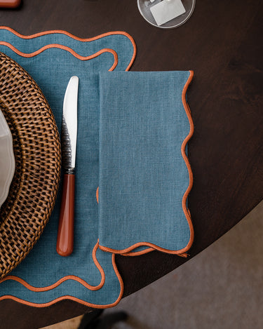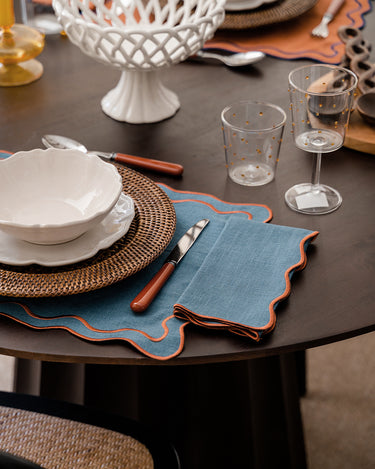 Com bordados ondulados contrastantes, estas peças destacam-se pelo design alegre e sofisticado, perfeitas para dar personalidade à mesa. Disponíveis em várias combinações de cores, permitem misturar e combinar para criar diferentes ambientes, desde ocasiões descontraídas até jantares mais formais.