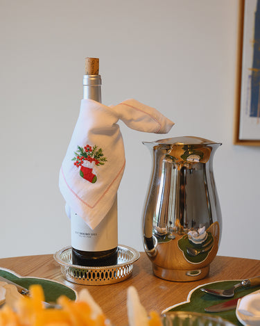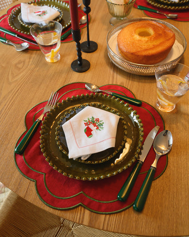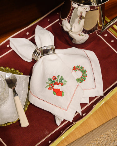 Napkins made of a linen and cotton blend fabric with a Christmas-themed embroidery. Each design features a distinct motif, ideal for setting festive tables and adding a traditional and cozy detail to year-end decoration.