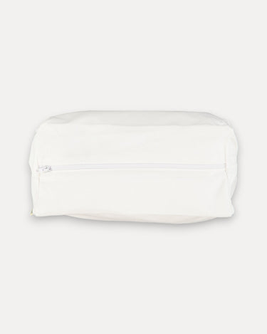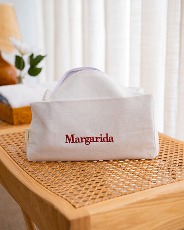Neceser de lino blanco, resistente y elegante, con detalle personalizable. Ideal para viajes y uso diario.