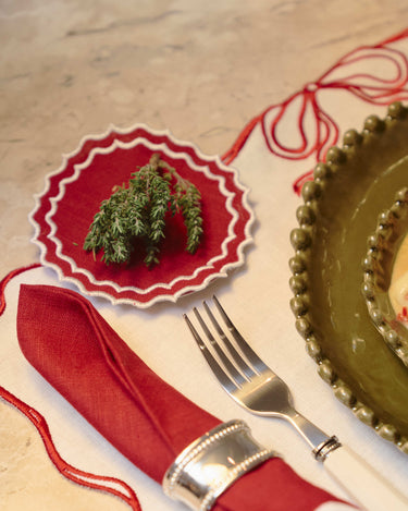 Posavasos de mezcla de lino y algodón, con corte circular y doble borde ondulado. Un detalle funcional y elegante para proteger superficies, añadiendo un toque de color y textura a la mesa.