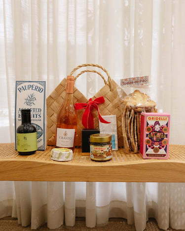 La Cesta Natal Sublime combina los mejores sabores artesanales portugueses con notas de distinción - aceite y mermelada Lote 26, chocolates y vinagre Gridelli, galletas Paupério y el inconfundible Vino Crasto. Una selección que transforma cualquier mesa en un escenario navideño inolvidable.