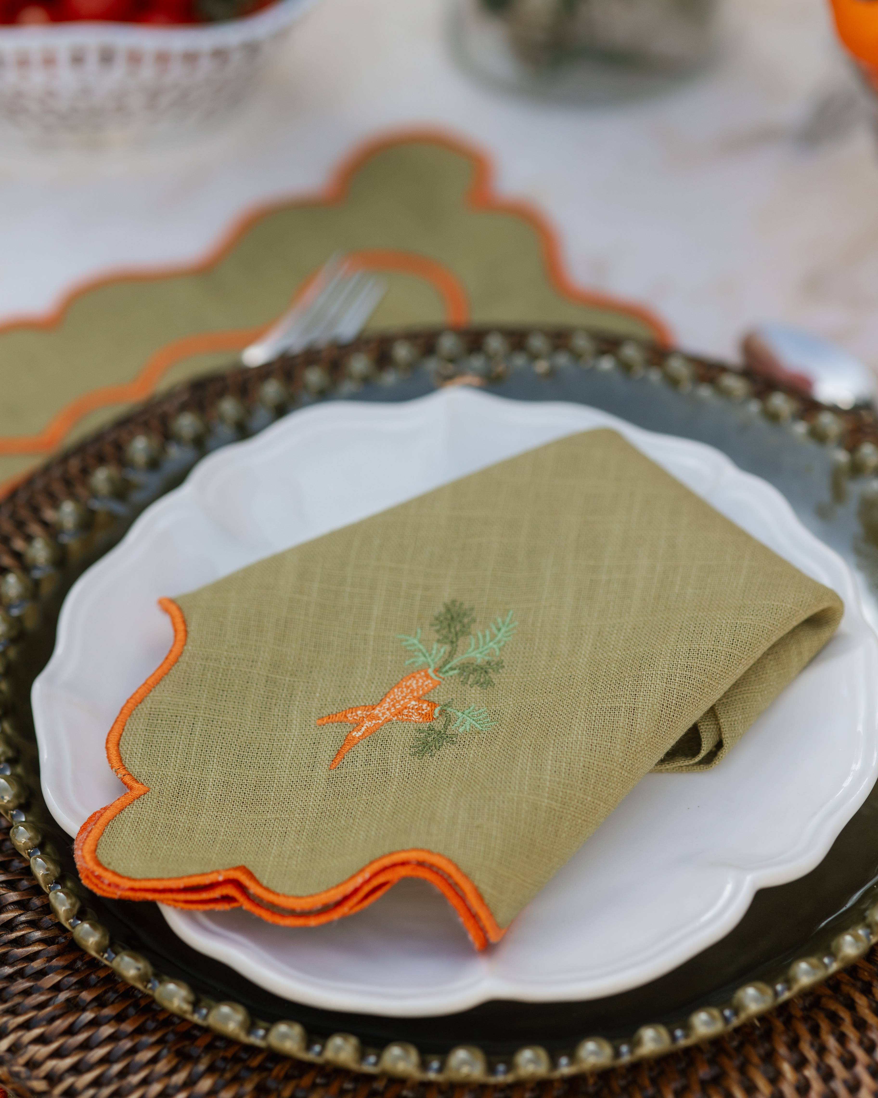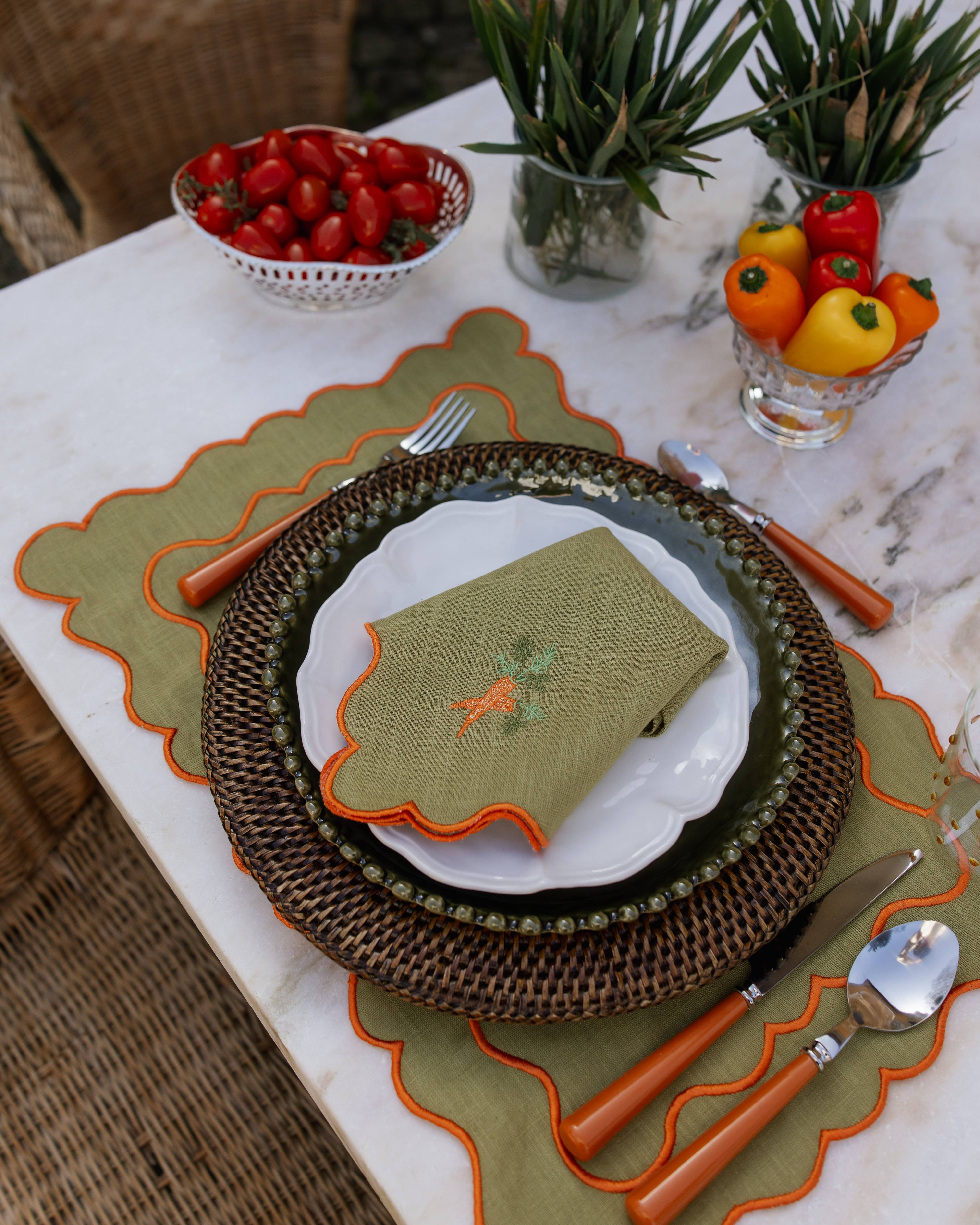 Servilleta de mesa en mezcla de lino y algodón de color verde seco. Presenta un borde ondulado con un remate bordado en hilo color naranja en contraste y un detalle bordado de una zanahoria.