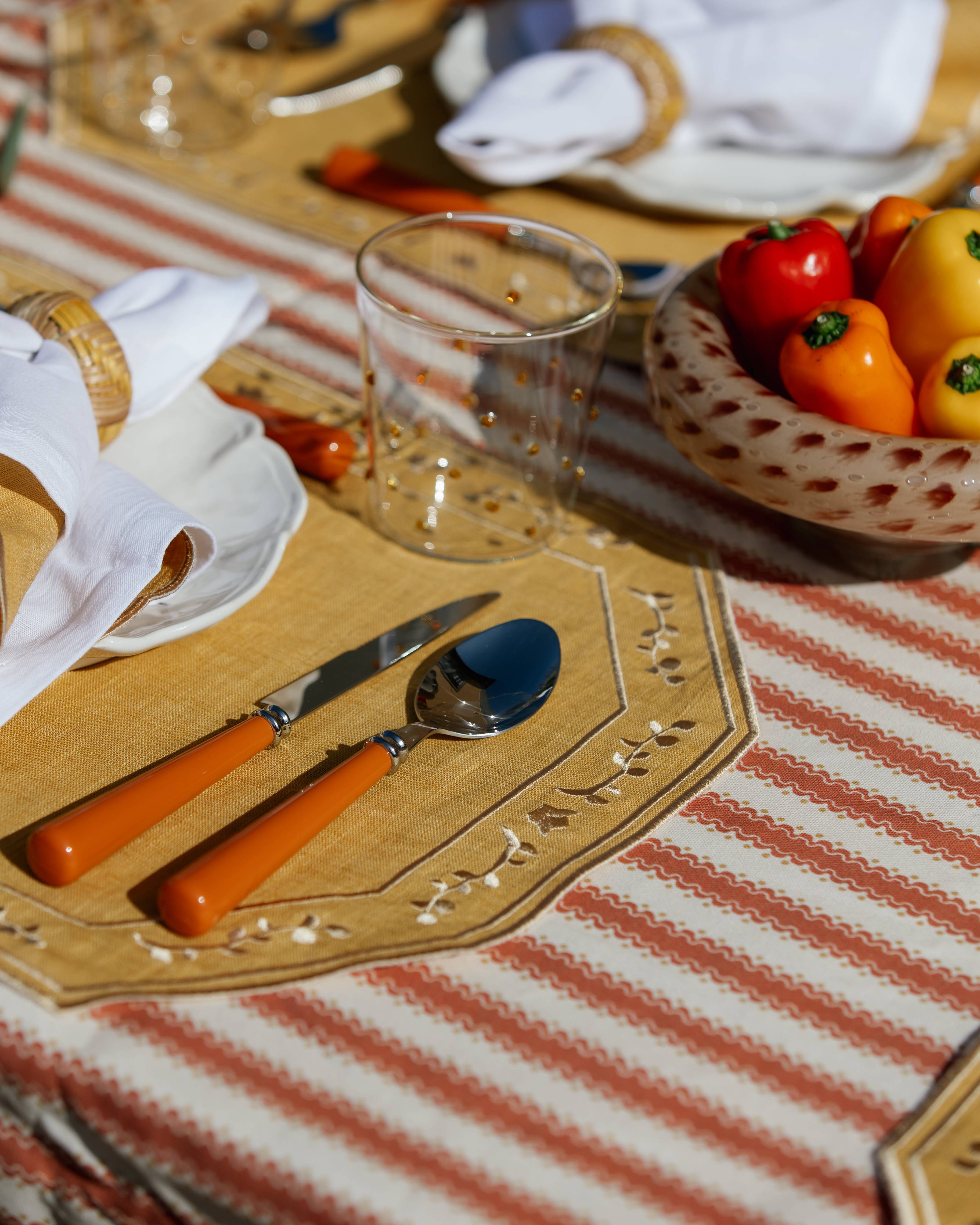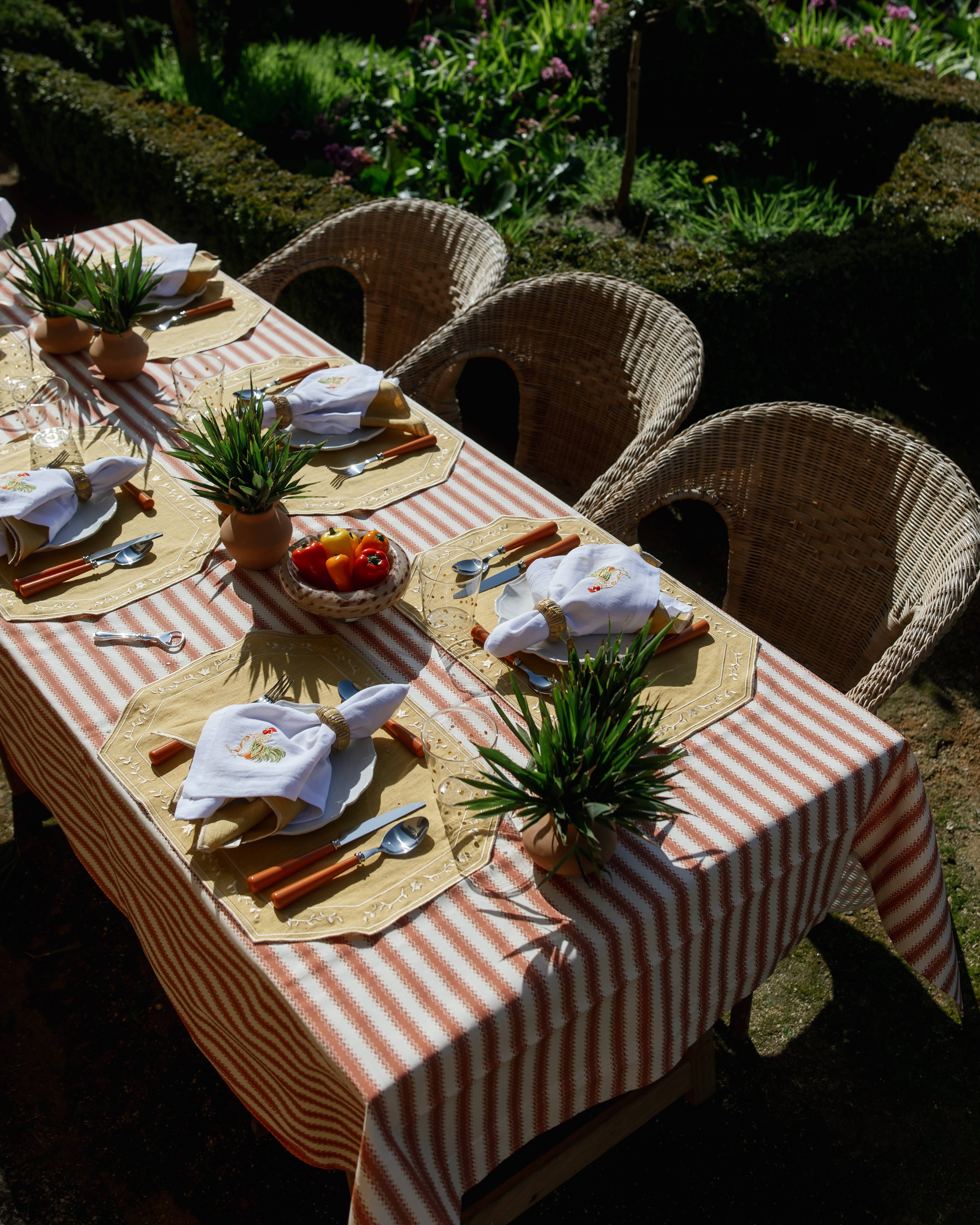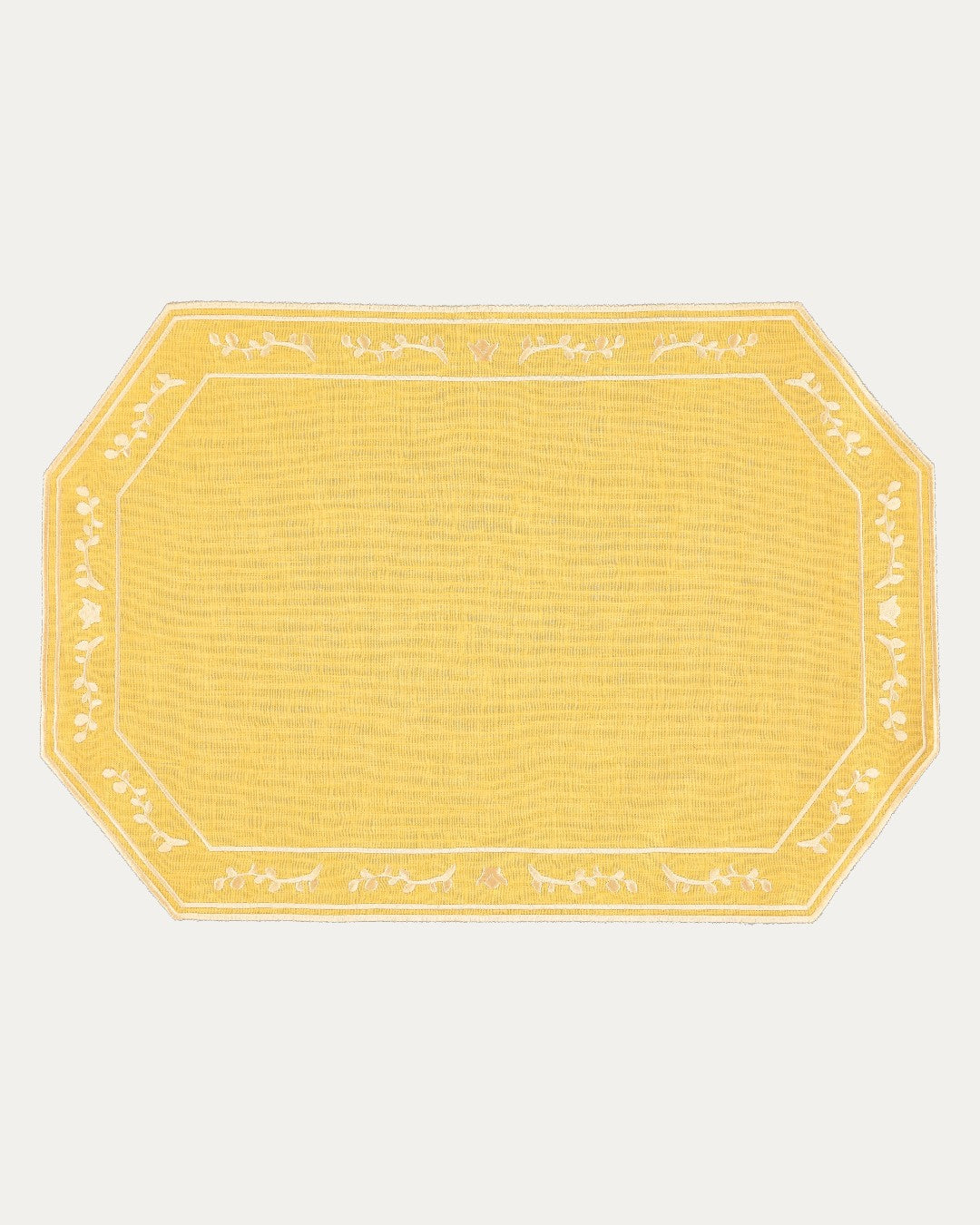Mantel Individual de mesa octogonal con marco decorativo, bordado con motivos botánicos contrastantes.