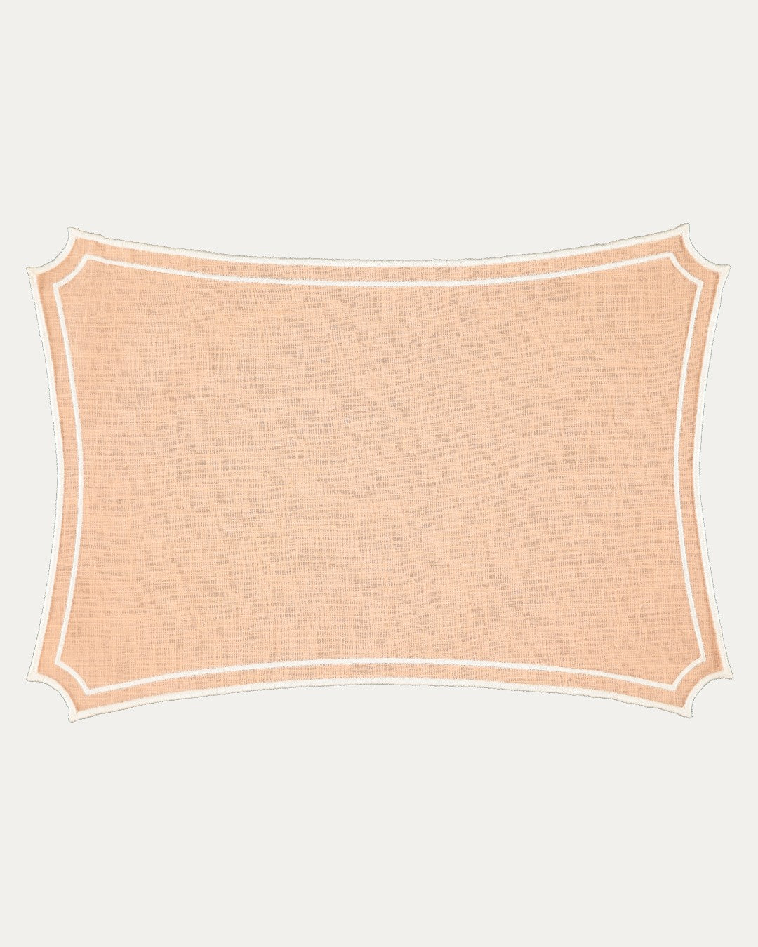 Mantel Individual rectangular con silueta de líneas cóncavas y esquinas pronunciadas. Con ribete doble bordado en tono contraste, que recorre todo el perímetro de la pieza.