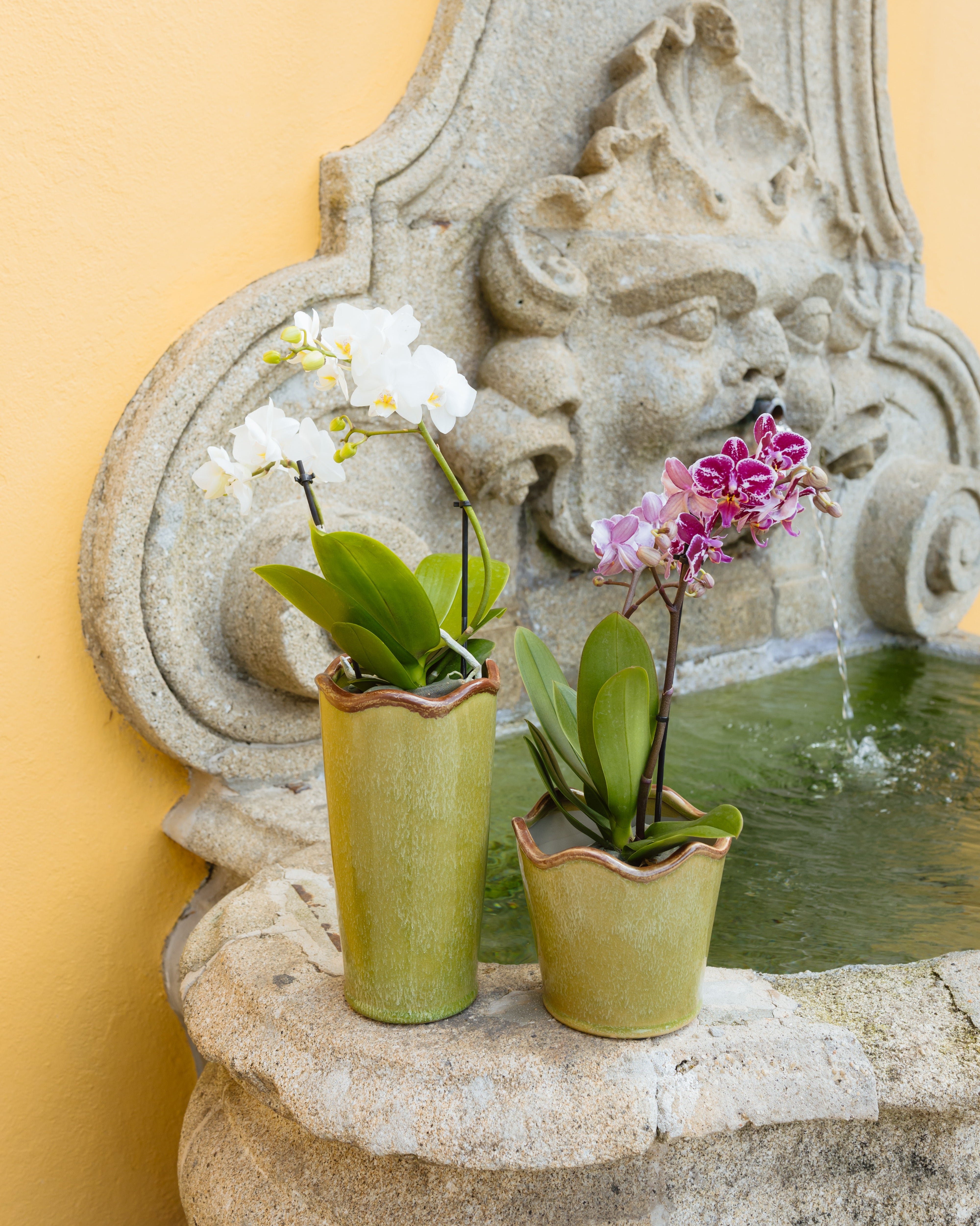 Jarra de cerámica con acabado vidriado en tono verde y efecto texturizado. Destaca por su borde ondulado de inspiración orgánica. Una pieza diseñada para contener ramos y composiciones florales, ideal para celebrar la tradición y el acto de regalar.