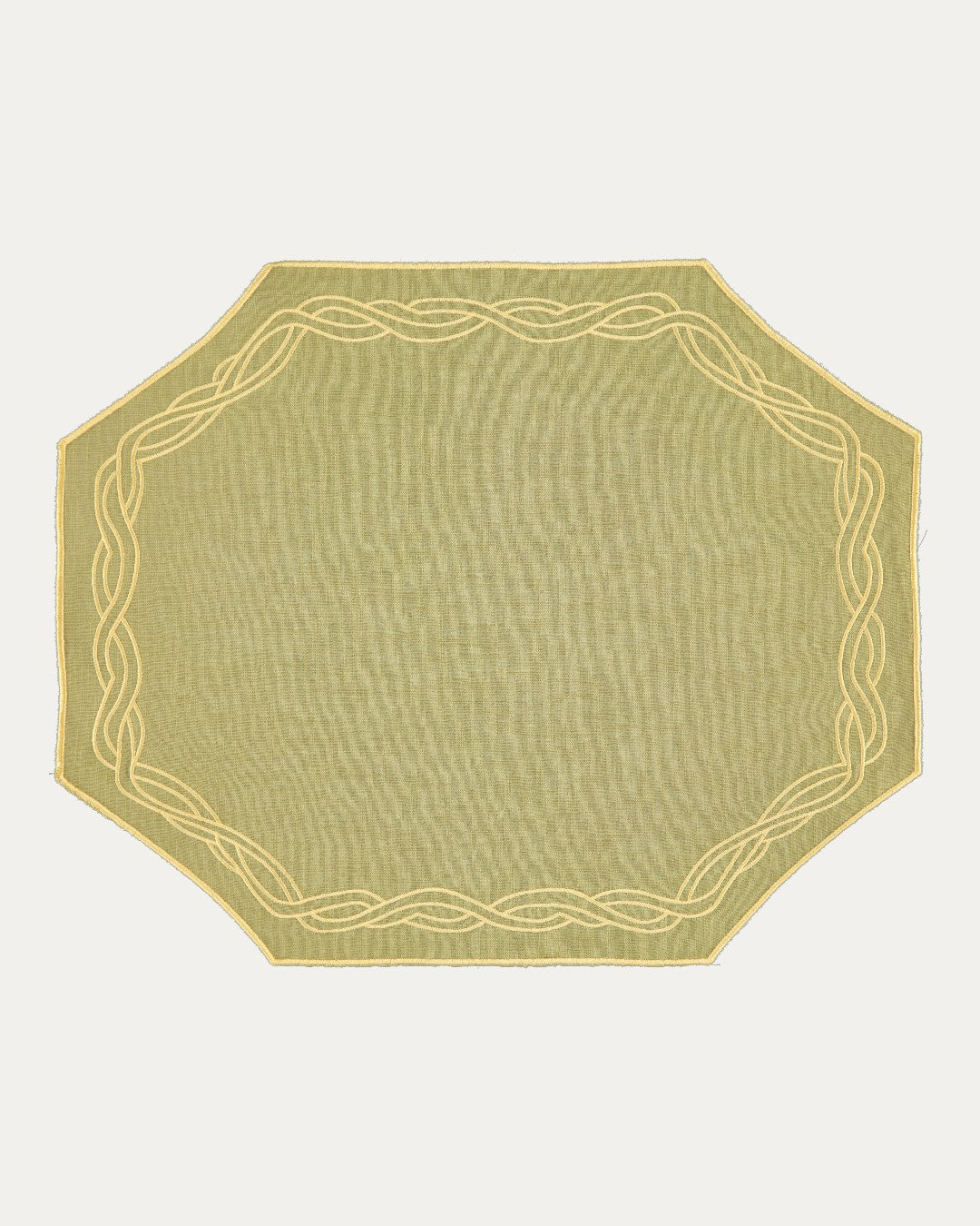 Mantel Individual en forma octogonal irregular con acabado en ribete y bordado en patrón de cuerda entrelazada que recorre todo el borde interno, siguiendo la silueta octogonal de la pieza.