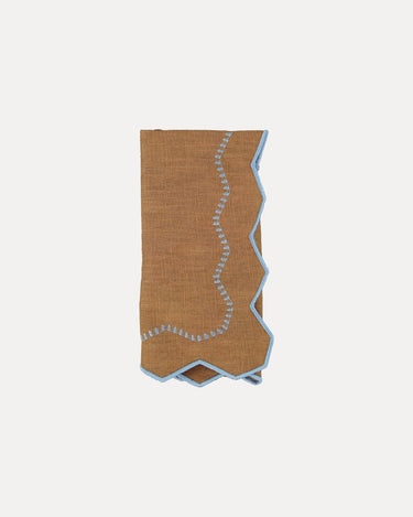 La servilleta Alba combina el tono marrón de la tela de lino mezclado con el detalle bordado en azul claro, en un contraste sutil y refinado. El acabado con corte ondulado le confiere originalidad, convirtiéndola en el complemento perfecto para mesas elegantes y contemporáneas.