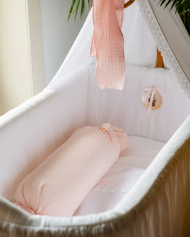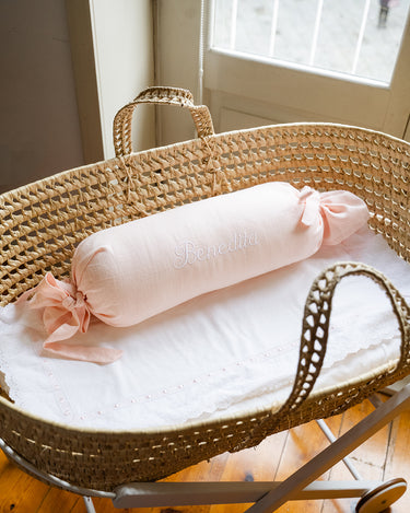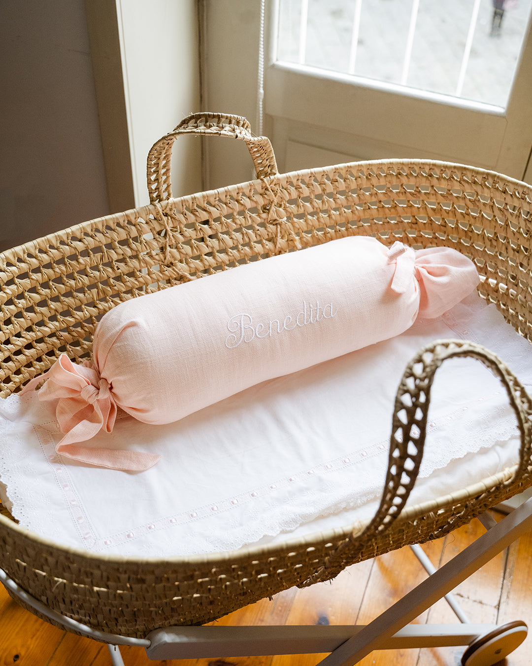 Almohada antirrodamiento en 100% lino personalizable para cama de bebé. La almohada antirrodamiento está compuesta por un rollo cerrado con dos cintas. El interior es extraíble para que el exterior pueda ser lavado y desinfectado.