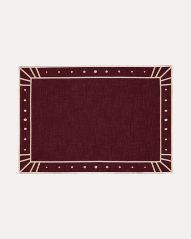 Individual retangular em linho e algodão, no tom salmão, com contorno em bordeaux que destaca a delicadeza do desenho geométrico e pontuado nas margens. Uma peça que combina subtileza e personalidade, perfeita para enriquecer a mesa com um detalhe sofisticado.