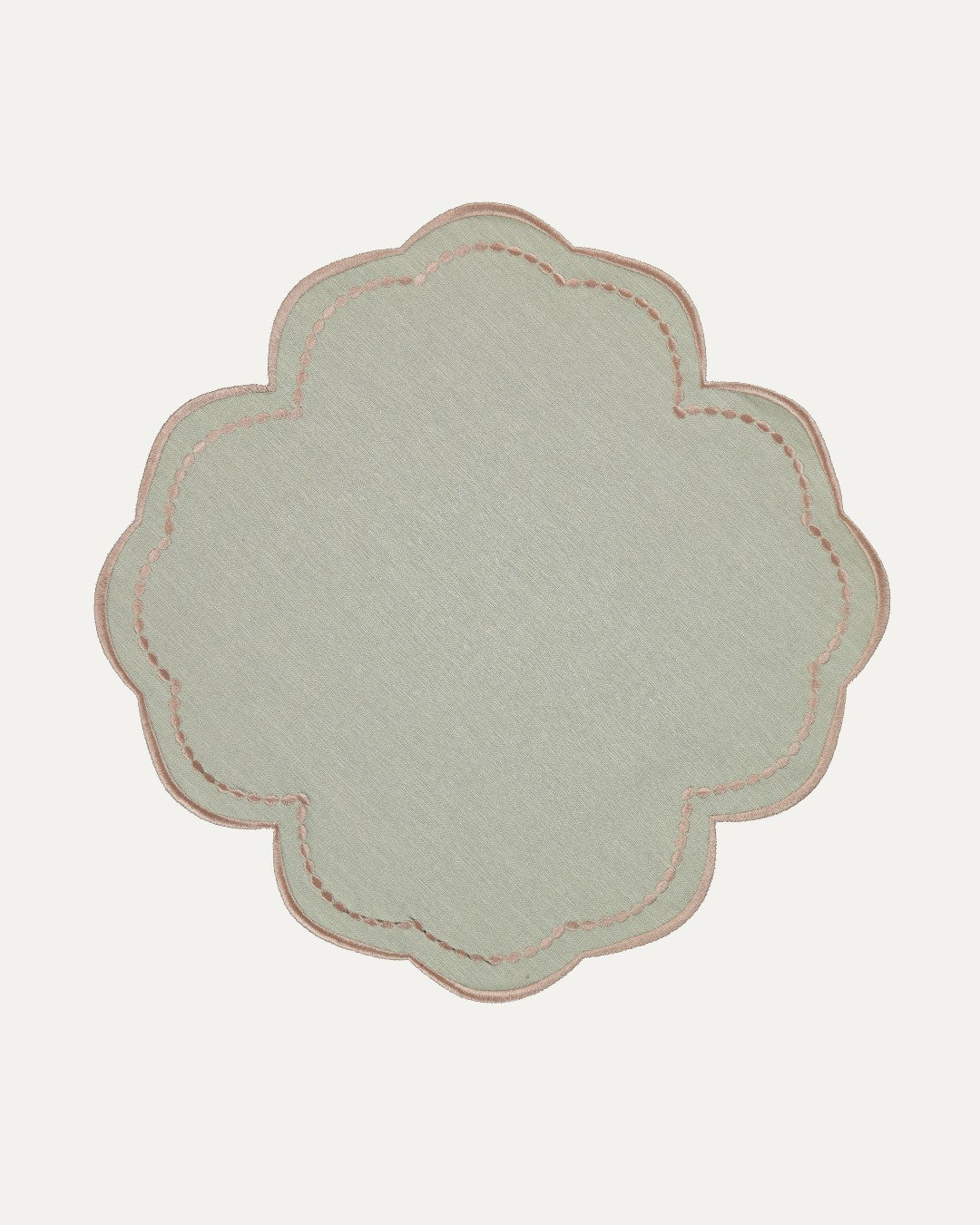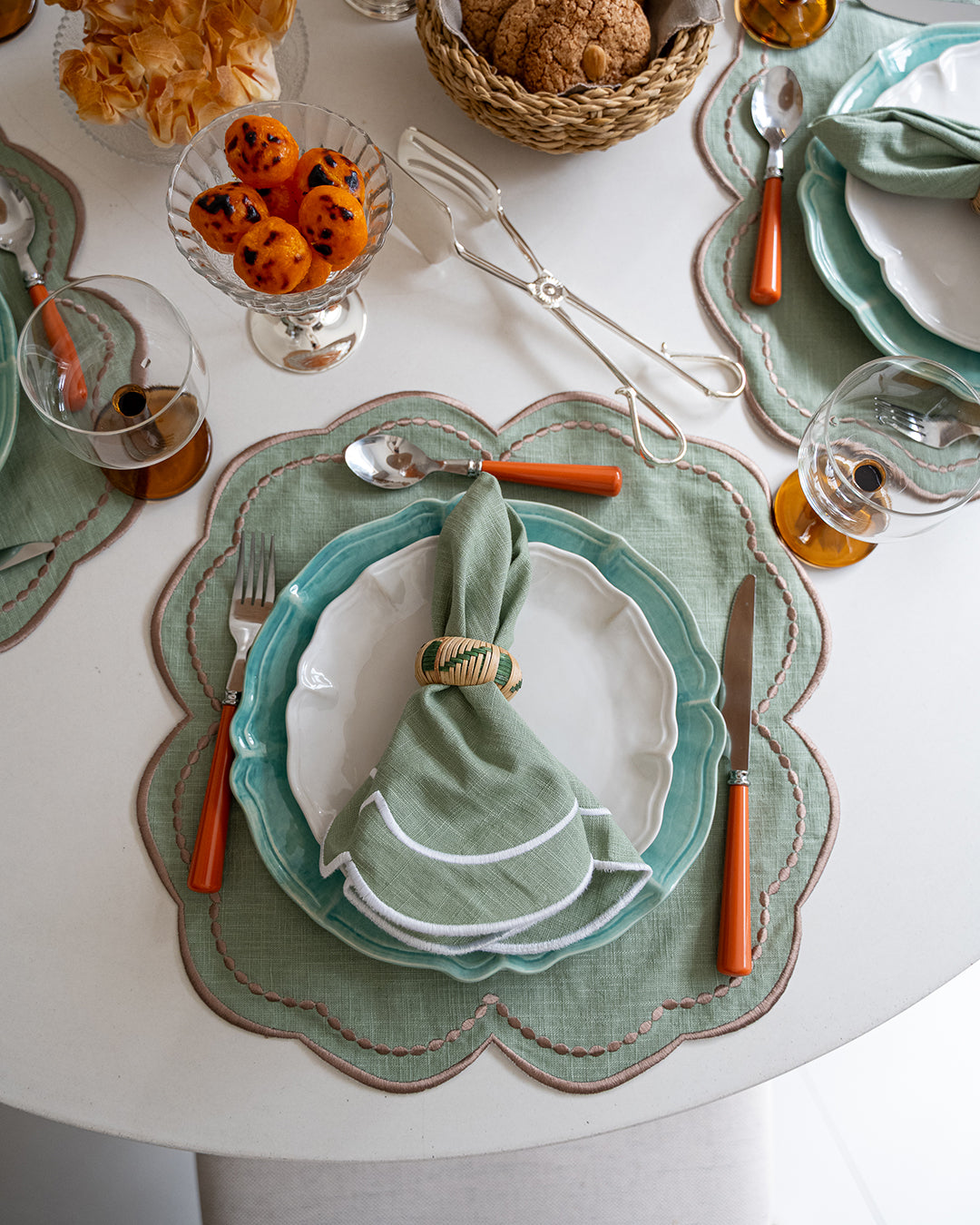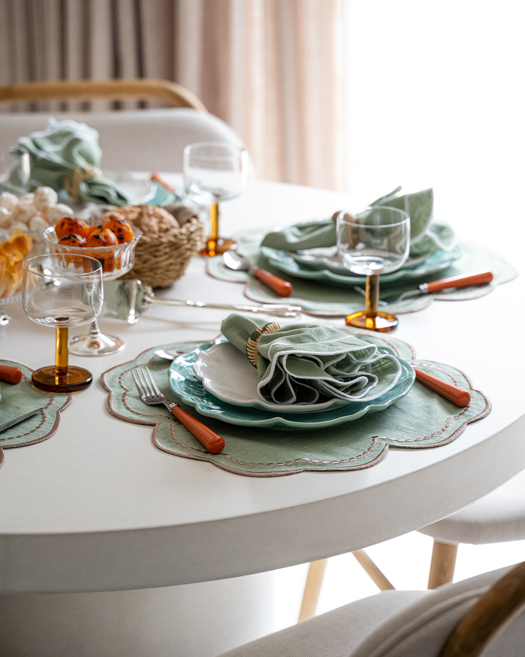 Mantel Individual redondo con recorte en forma de pétalo y bordado contrastante. Producido en mezcla de lino y algodón, combina textura natural con resistencia, siendo adecuado tanto para el uso cotidiano como para composiciones de mesa más festivas.