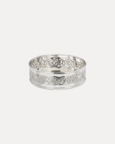 Un accesorio que combina elegancia clásica con detalles calados que evocan piezas de orfebrería tradicional. Este soporte es perfecto para botellas de vino o aceite, aportando sofisticación inmediata a la mesa. Fabricado en metal plateado, destaca por la estructura calada que deja traslucir la luz de forma sutil.
