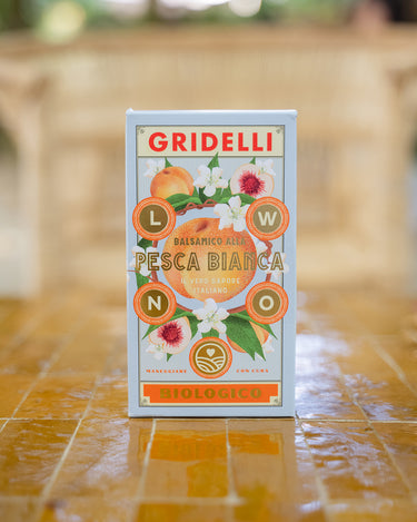 Hecho con uvas ecológicas y zumo de melocotones blancos ecológicos, así como aromas naturales de melocotón blanco. El Aceto balsámico alla Pesca bianca no contiene azúcar añadido ni colorantes.