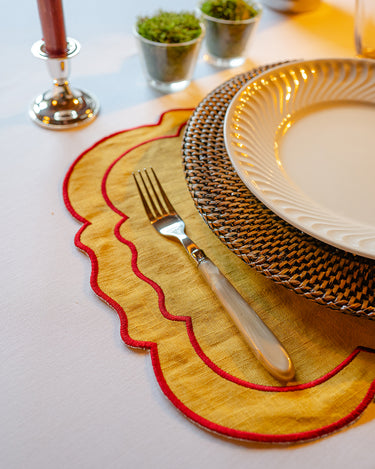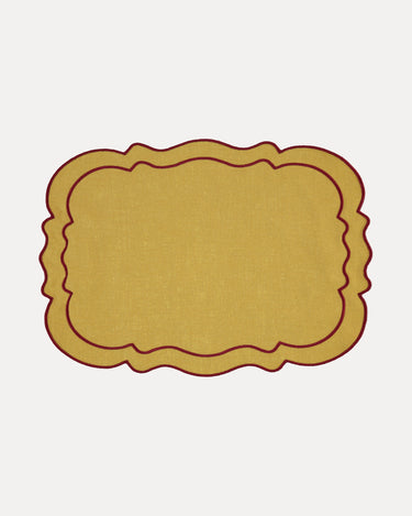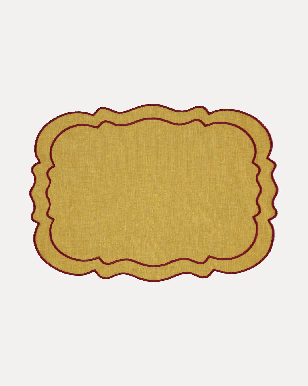 Le Clou individuel allie un design romantique à des bords arrondis, offrant charme et élégance à votre table. Désormais disponible dans une teinte moutarde avec un bordeaux festif, parfait pour la saison des fêtes.