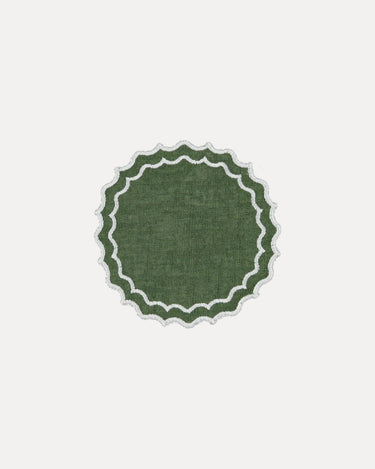 Sous-verre en mélange de lin et coton, avec découpe circulaire et double bord ondulé. Un détail fonctionnel et élégant pour protéger les surfaces, ajoutant une touche de couleur et de texture à la table.