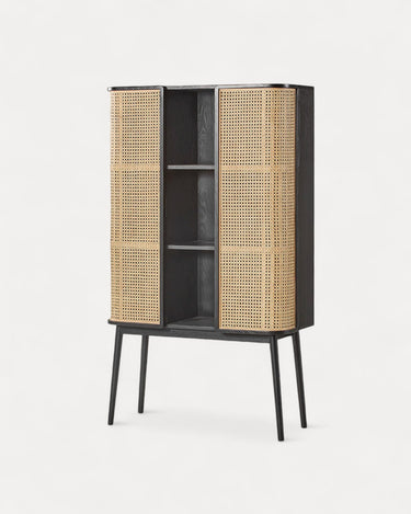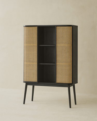 Le meuble haut Manila se distingue par sa verticalité et l'équilibre entre design moderne et matériaux naturels. Fabriqué en bois massif, il est parfait pour ceux qui recherchent une solution de rangement élégante dans des espaces compacts.