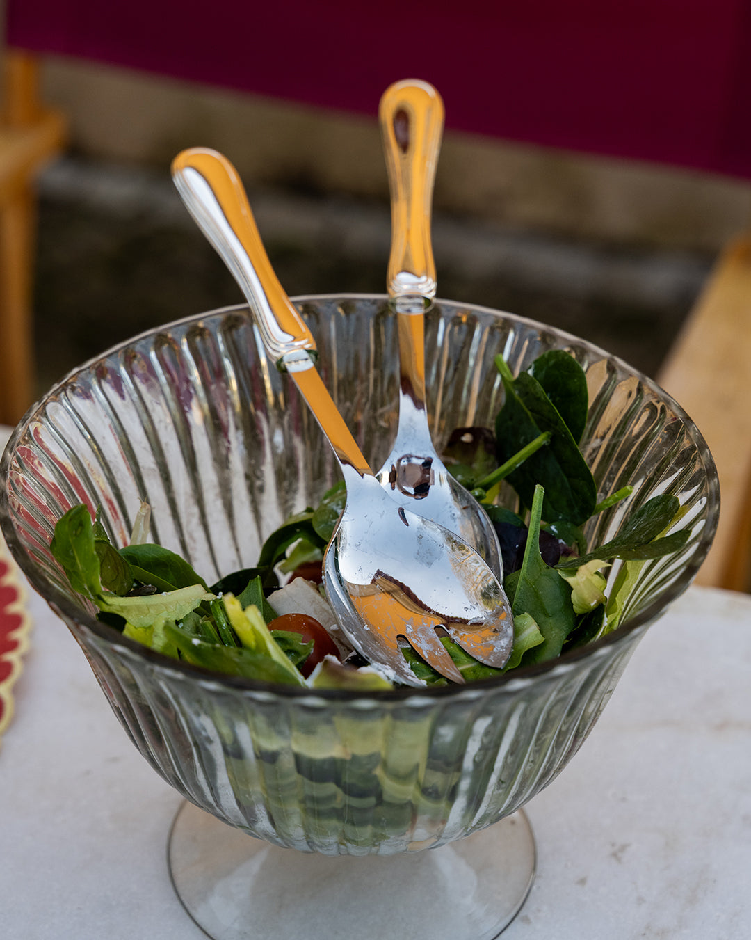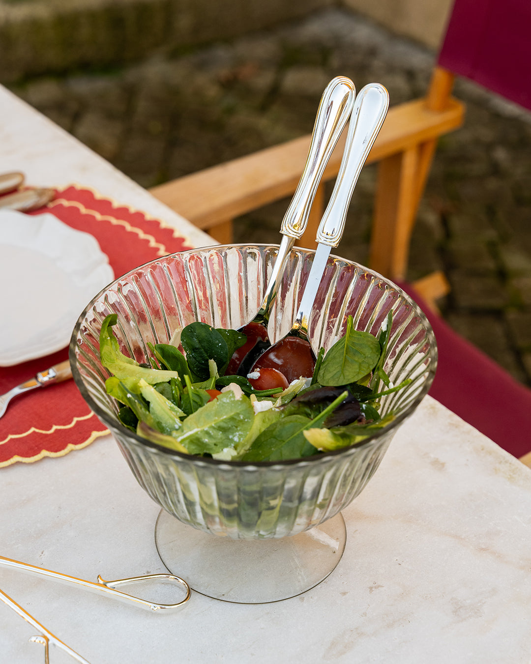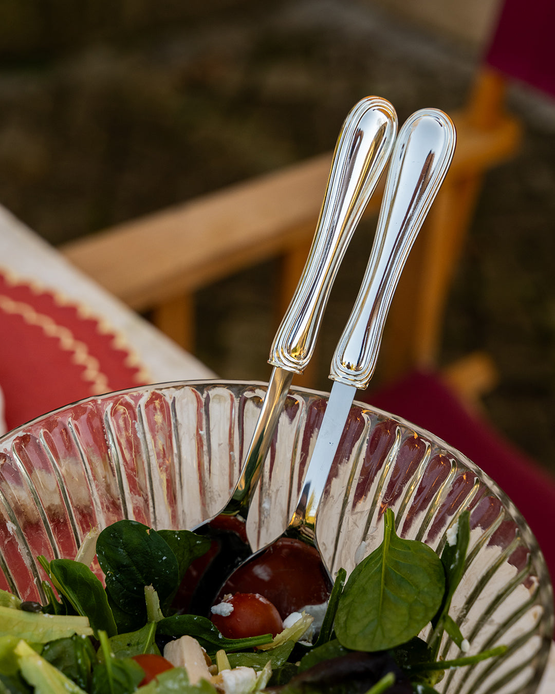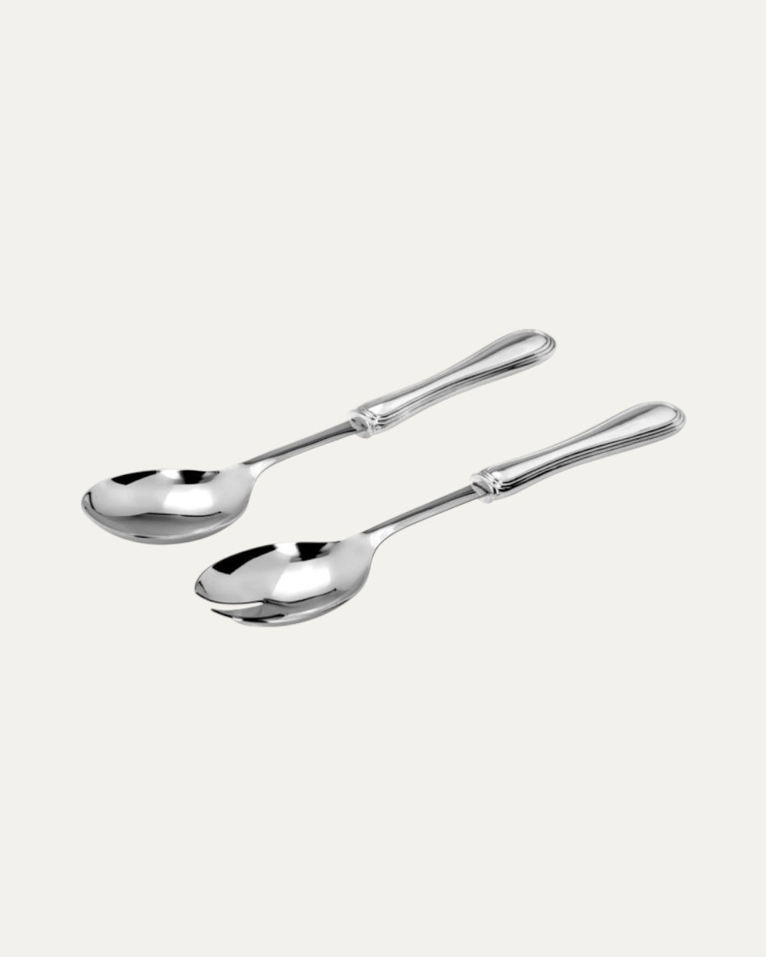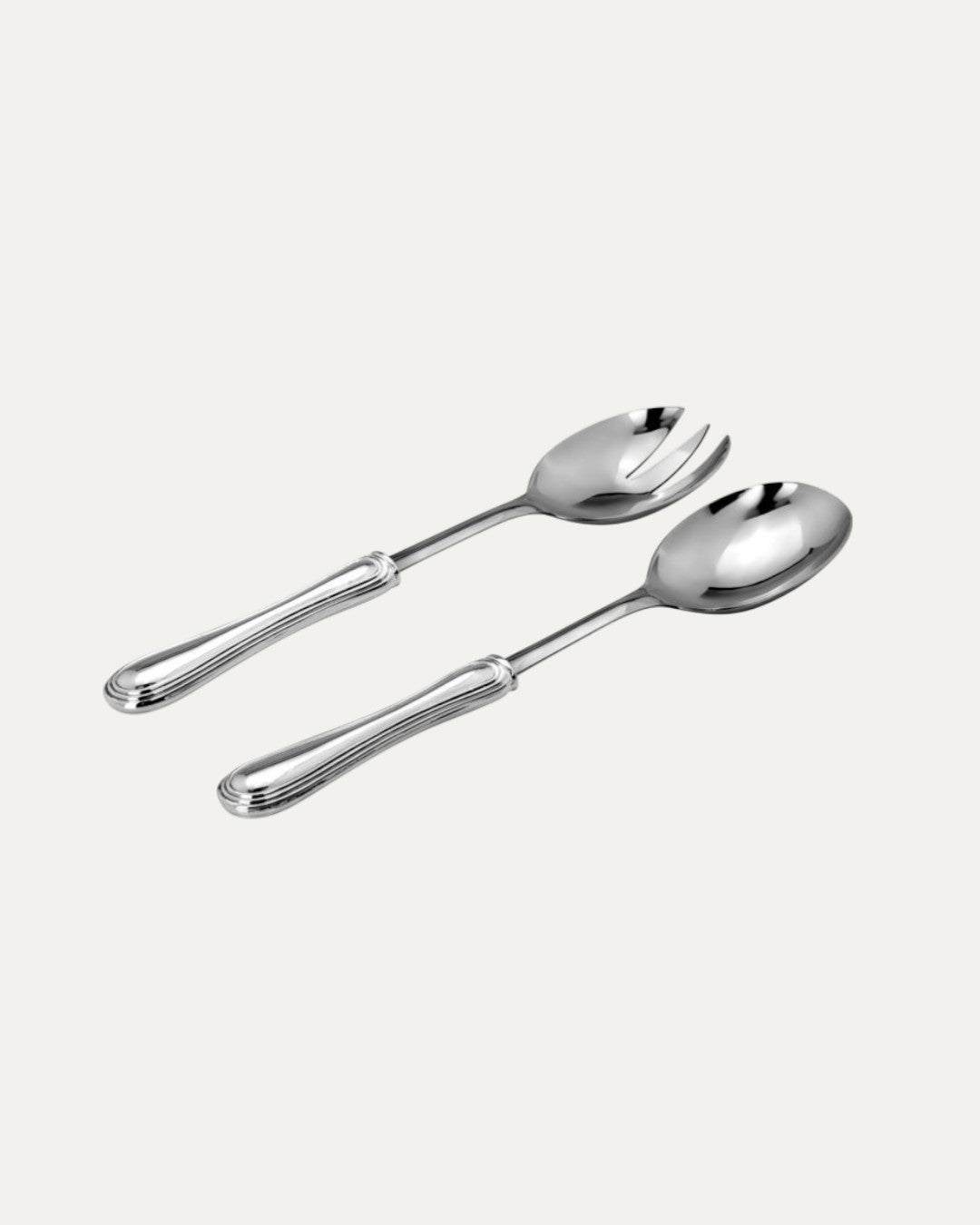 Ensemble de cuillère et fourchette de service pour salade avec finition argentée brillante. Design classique avec manches ergonomiques ornés de reliefs linéaires.