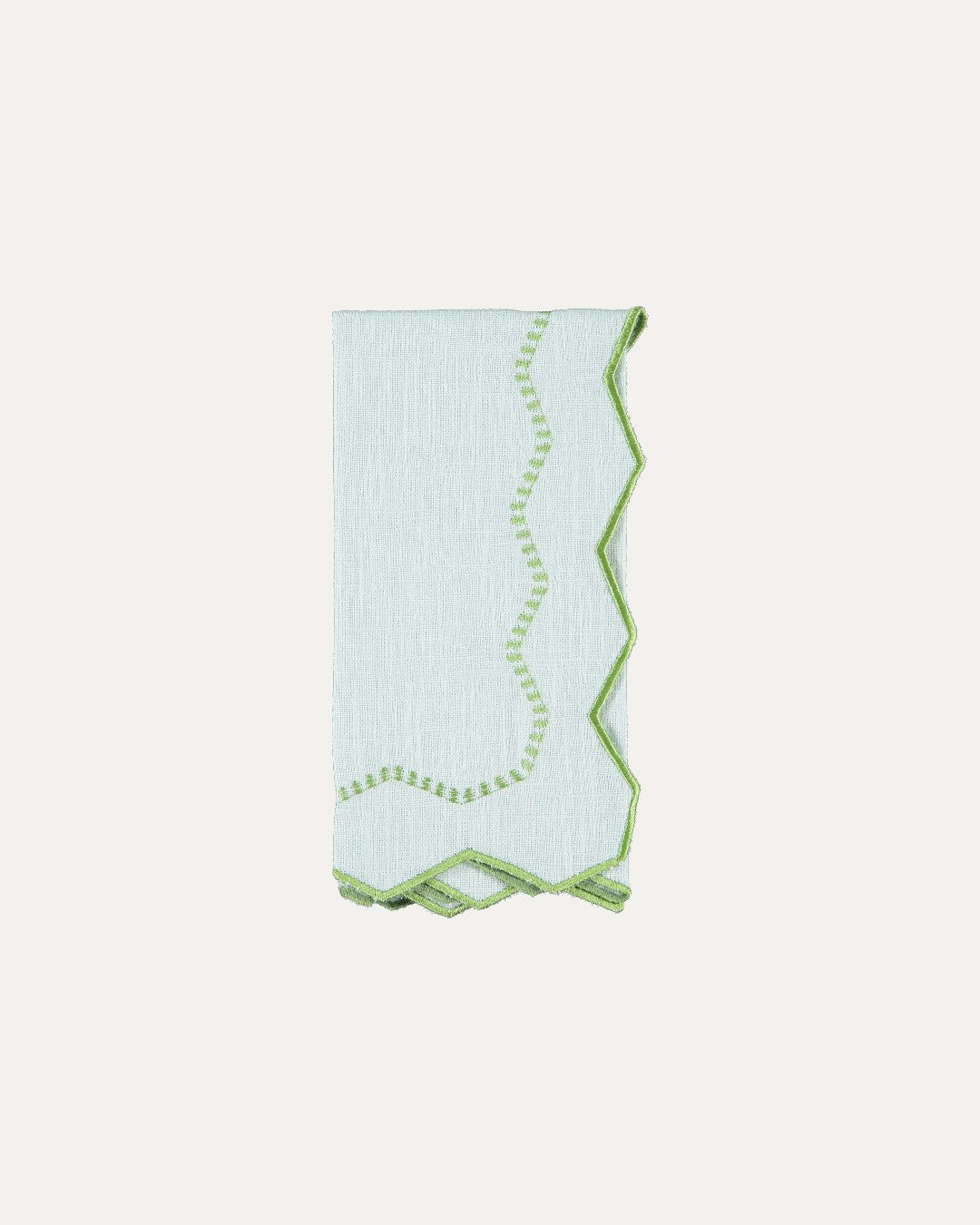 Serviette avec motif géométrique et bordure en zigzag, avec un ourlet intérieur ondulé en contraste.