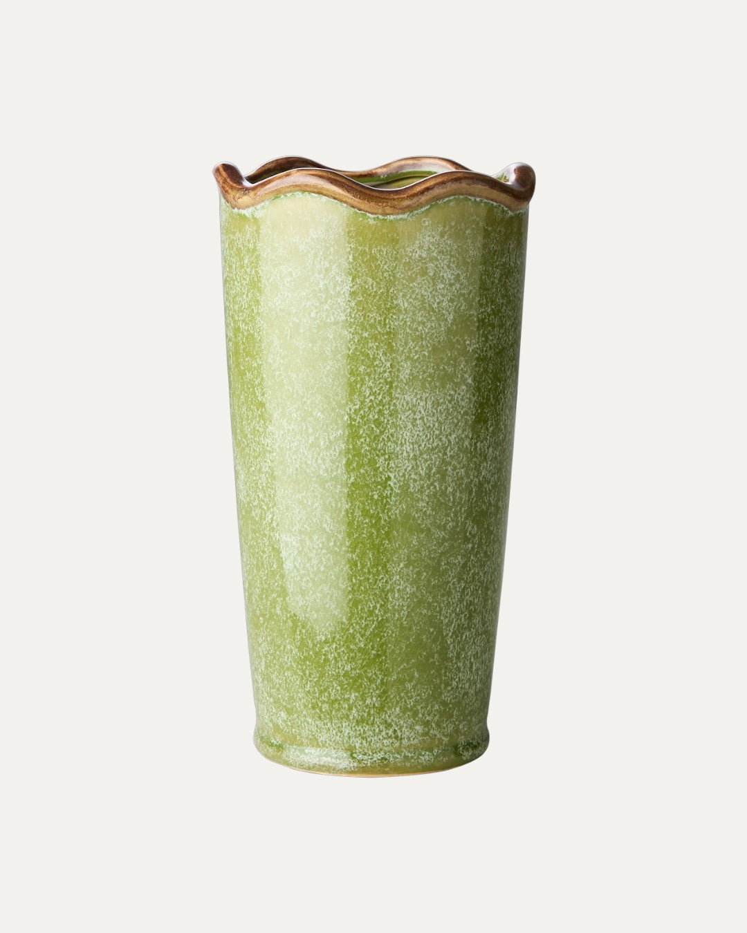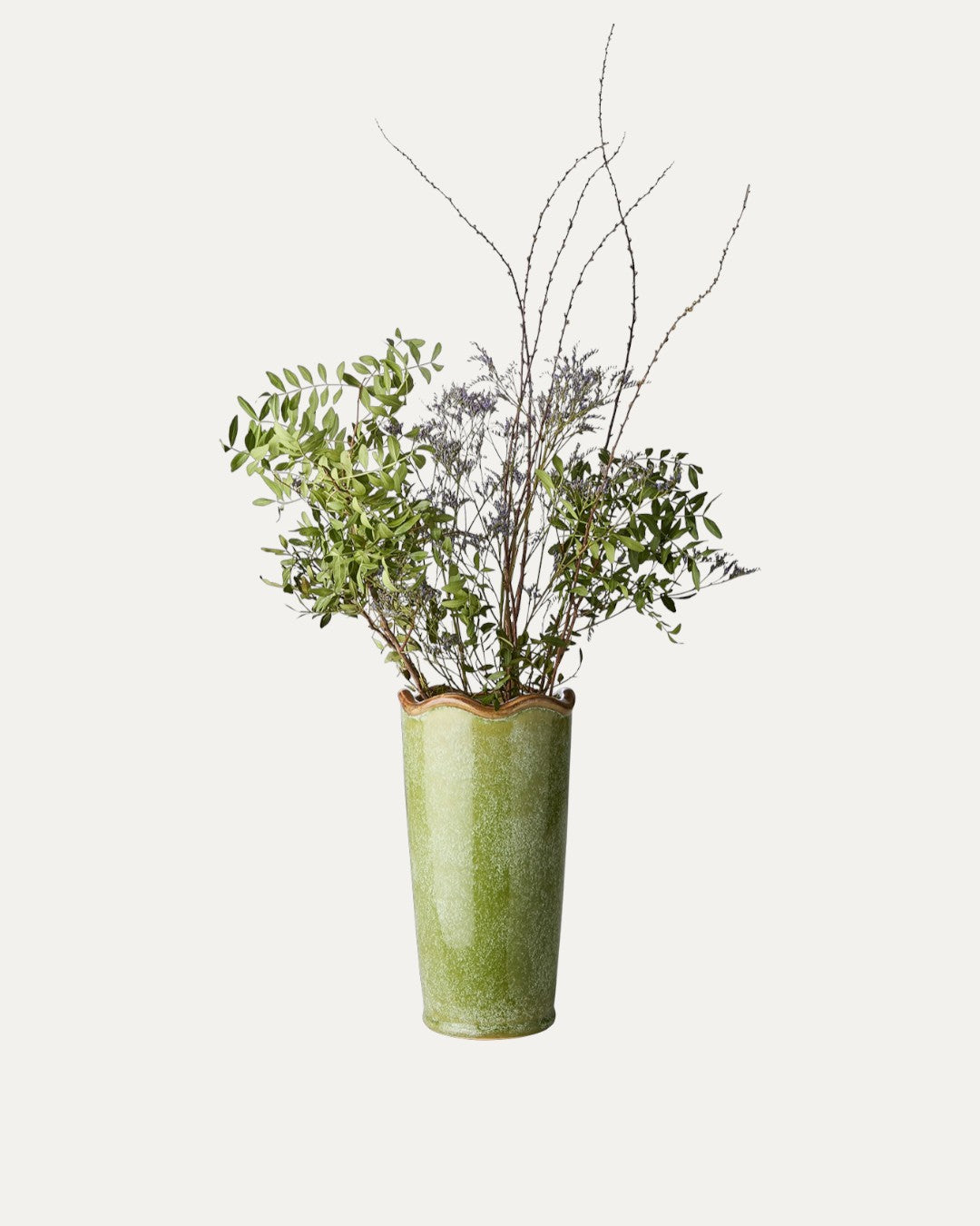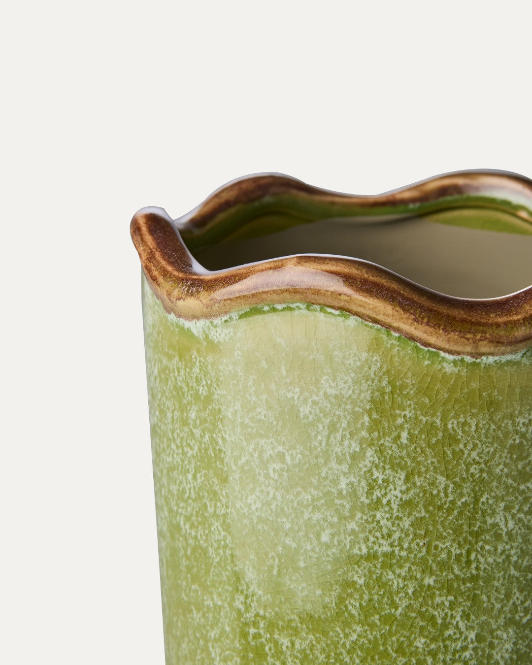 Cruche en céramique avec finition émaillée en ton vert et effet texturé. Elle se distingue par son bord ondulé d'inspiration organique. Une pièce conçue pour accueillir des branches et des compositions florales, idéale pour célébrer la tradition et le geste de l'offrande.