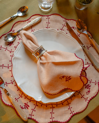 Questo tovagliolo si distingue per il bordo ritagliato e ricamato a contrasto, mantenendo l'armonia con i tovaglioli della stessa collezione. Realizzato in misto lino e cotone, offre una sensazione naturale e morbida, con una finitura resistente e di facile manutenzione.