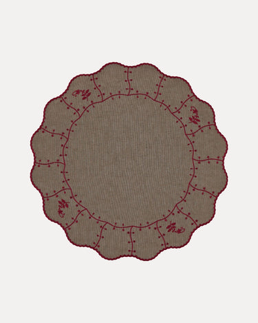 Questo tovaglietta ha una forma rotonda con bordo ondulato e ricamo a contrasto. Realizzato in tessuto misto lino e cotone, unisce resistenza ed eleganza, ideale per l'uso quotidiano o occasioni speciali.