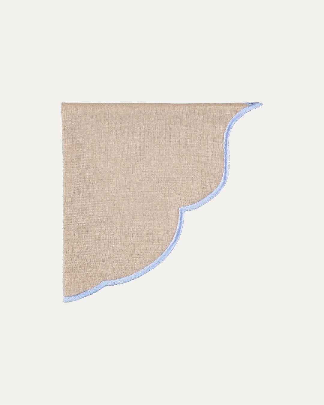 Tovagliolo quadratocon formato ornamentale e silhouette di linee concave e angoli pronunciati. Si distingue per la finitura con bordo ricamato di colore a contrasto che definisce il disegno ritagliato del pezzo e aggiunge un dettaglio decorativo.
