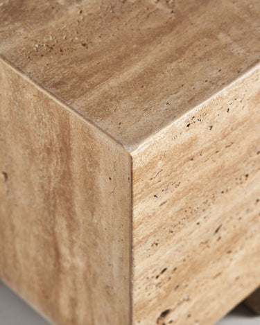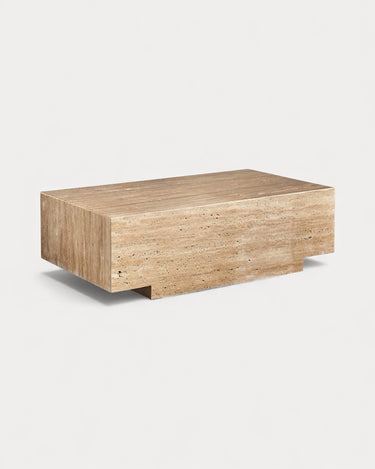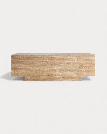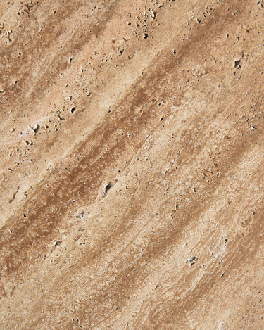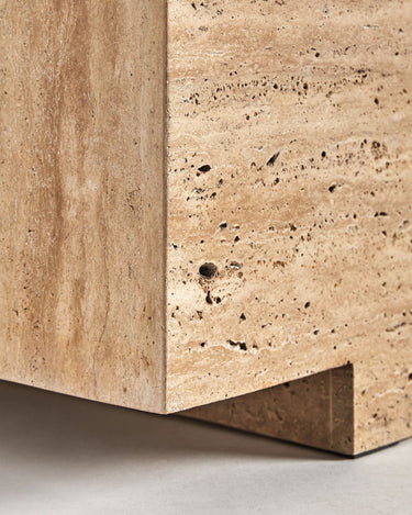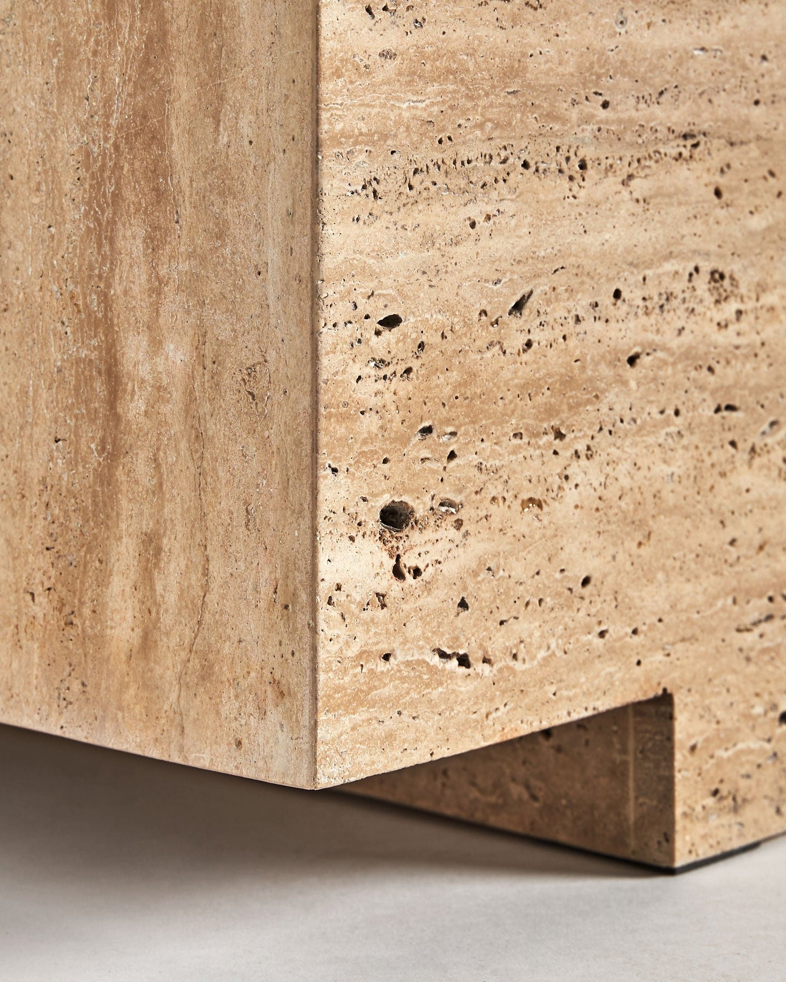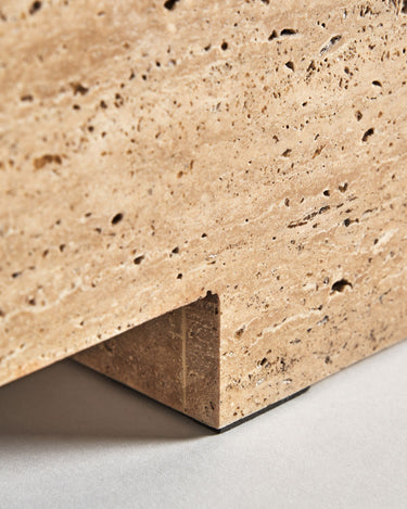 Il tavolino Tarsin è interamente scolpito in travertino beige, distinguendosi per la sua presenza monolitica e l'estetica ispirata all'art déco. La forma geometrica con tagli inferiori crea leggerezza visiva senza compromettere la robustezza del pezzo. Le texture naturali del travertino, inclusi venature, pori e variazioni di tonalità, rendono ogni tavolo unico.