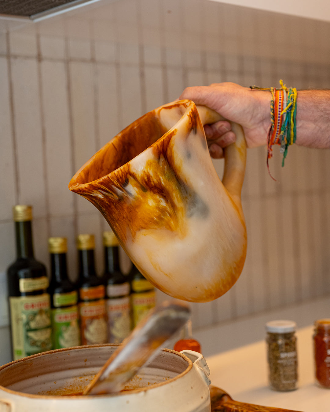Brocca in resina con motivo marmorizzato in tonalità miele. A causa della natura della resina, possono verificarsi variazioni di colore, rendendo ogni prodotto unico.