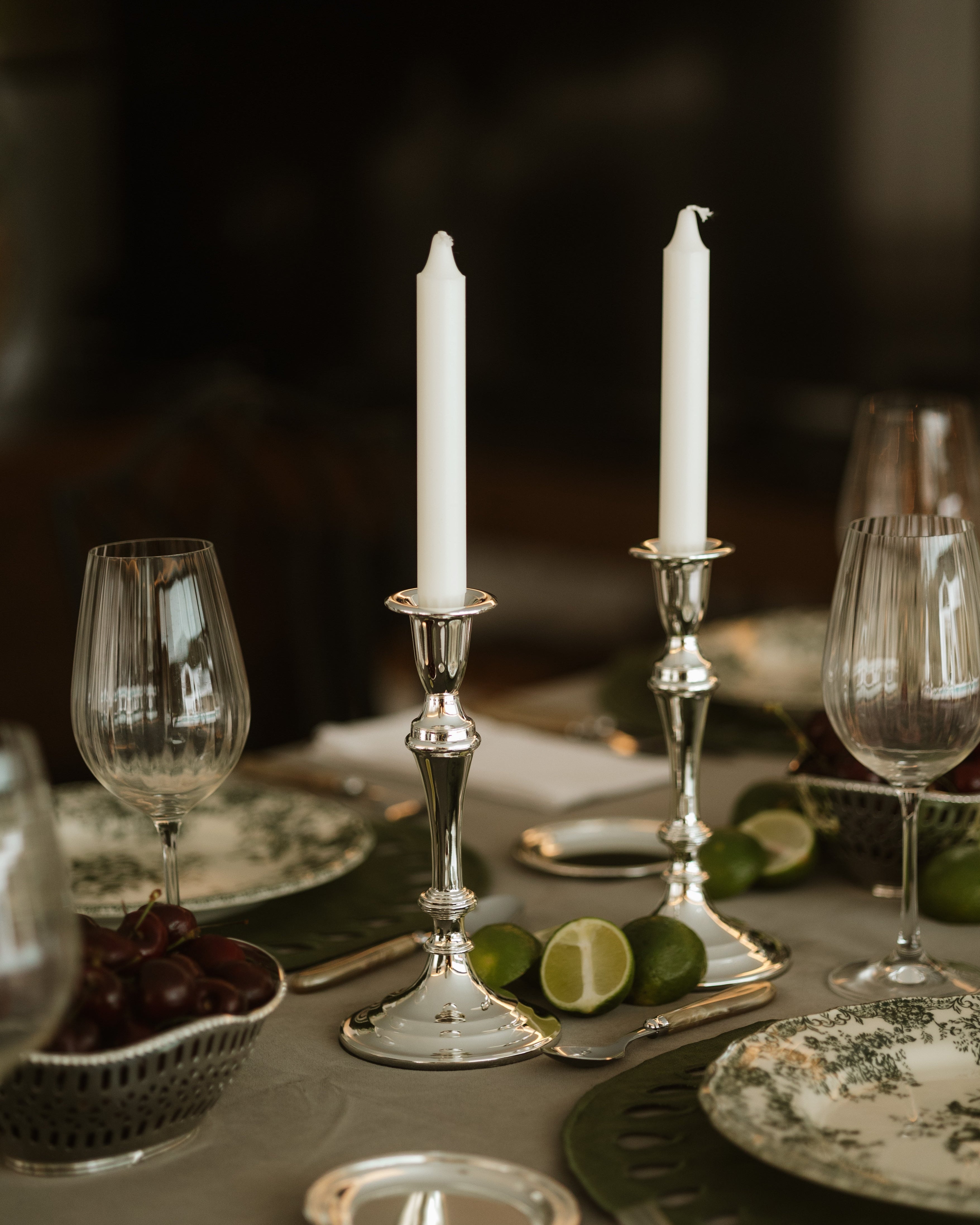 Con la sua finitura argentata e la base arrotondata, riflette la luce delle candele con dolcezza, rendendo ogni pasto o momento speciale ancora più accogliente.