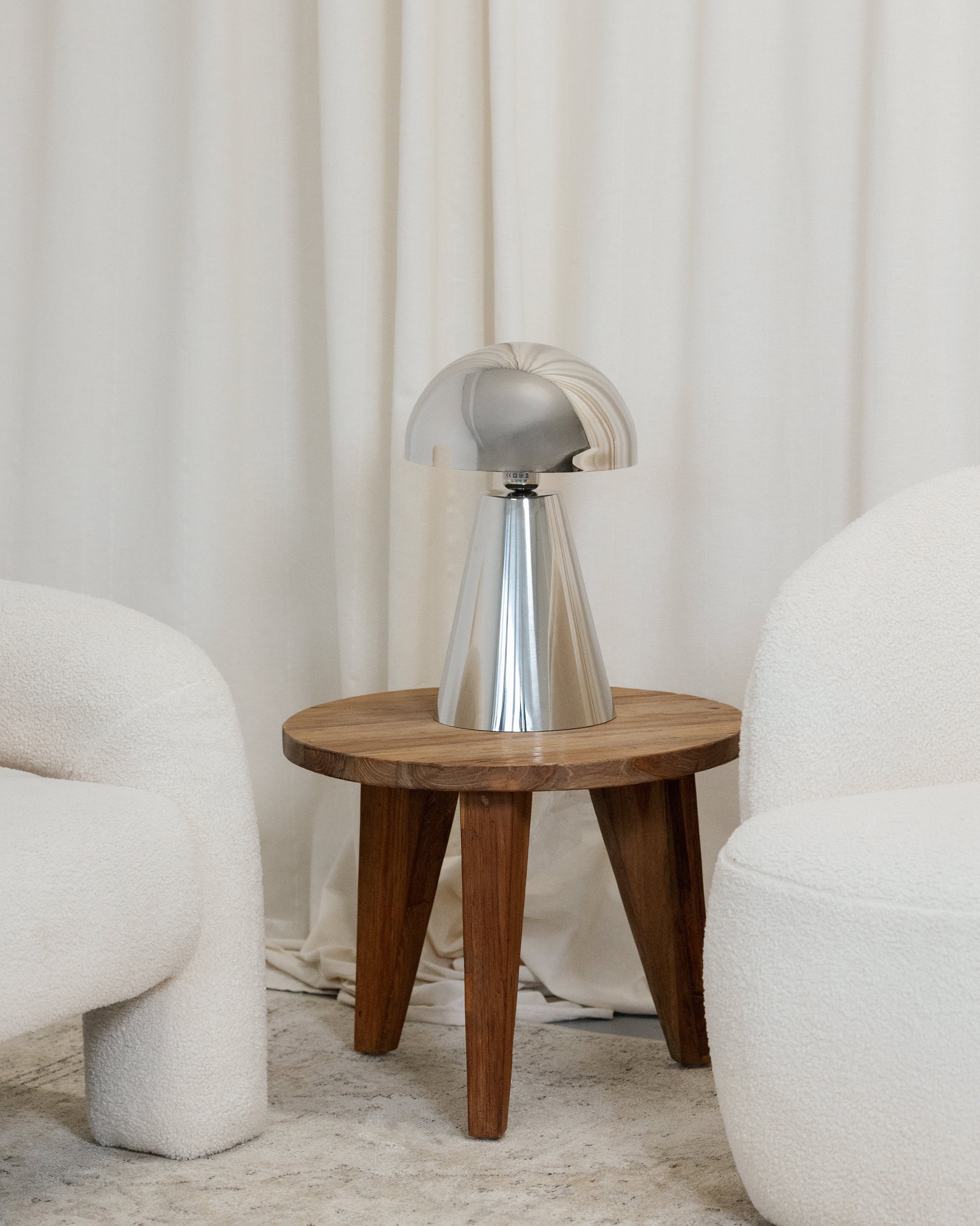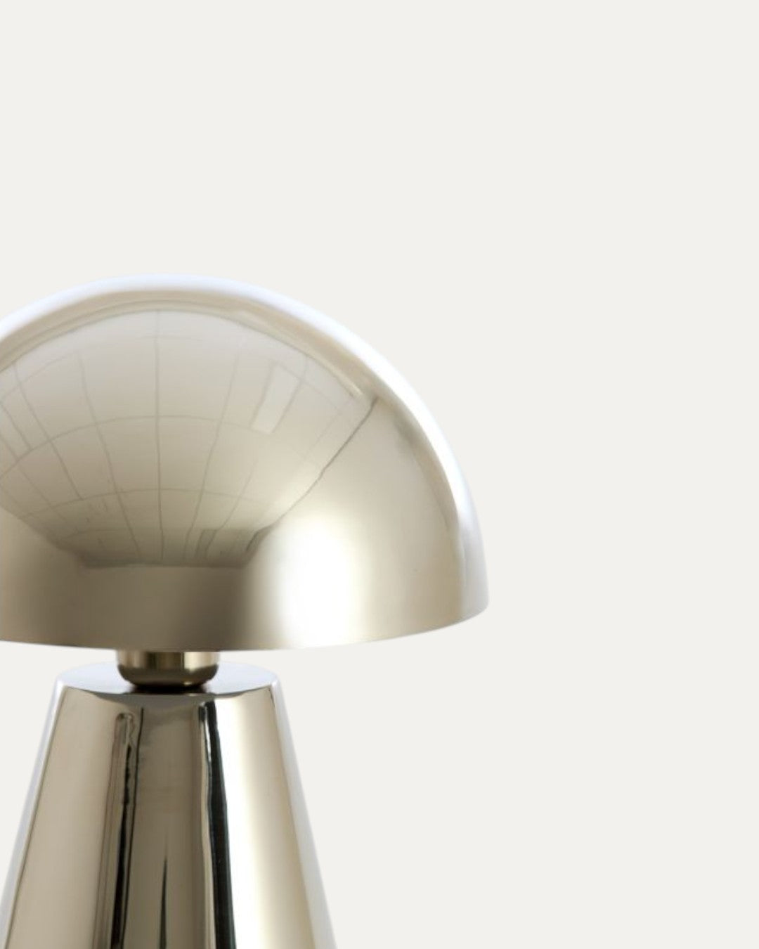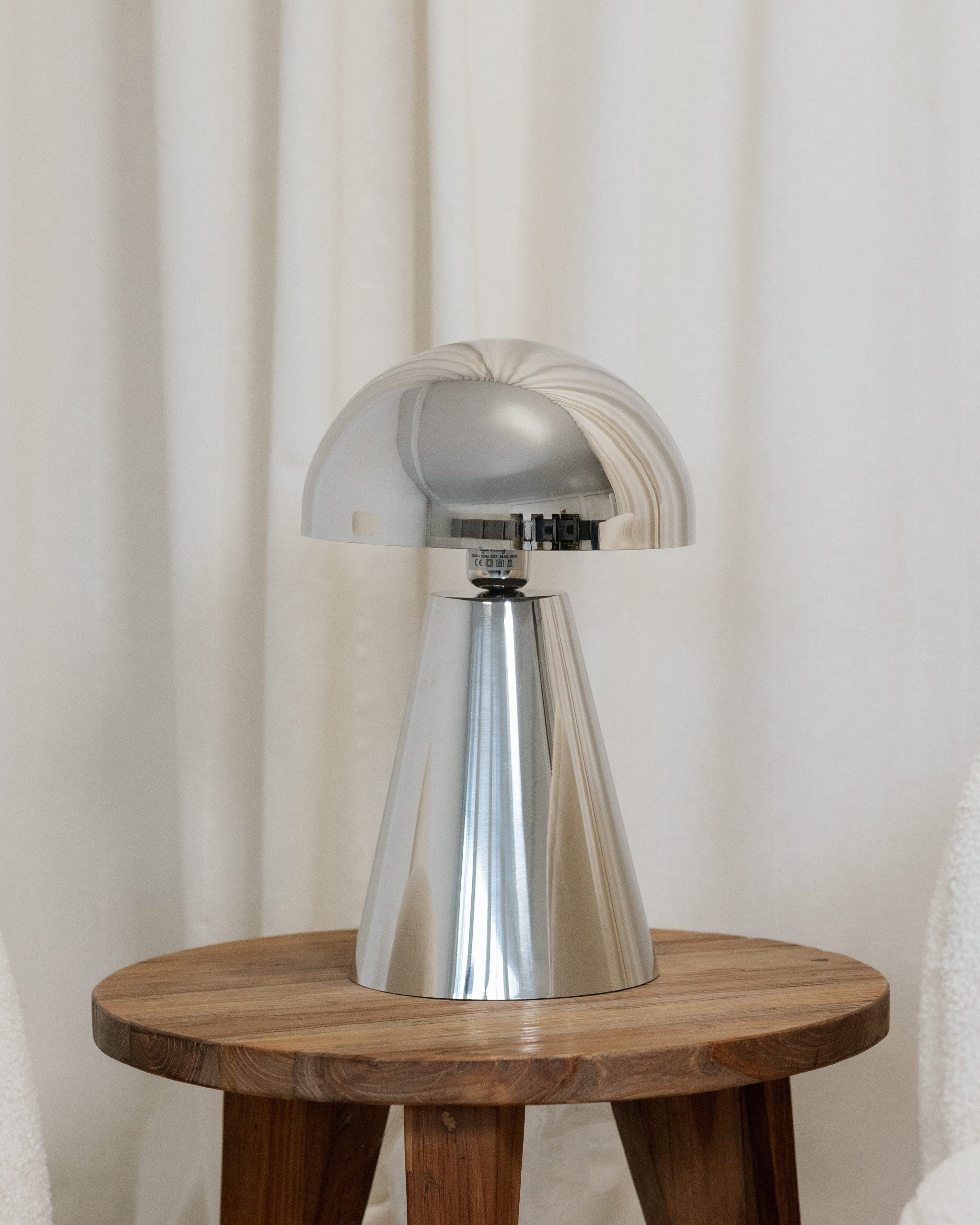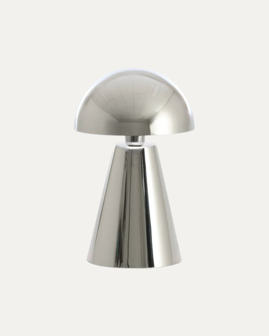 O Candeeiro Argenté destaca-se pelo seu design geométrico e acabamento metálico de alto brilho. Composto por uma base cónica estável e uma cúpula em semiesfera, esta peça em níquel polido oferece uma estética contemporânea e minimalista, adaptando-se facilmente a ambientes modernos ou de inspiração retro.