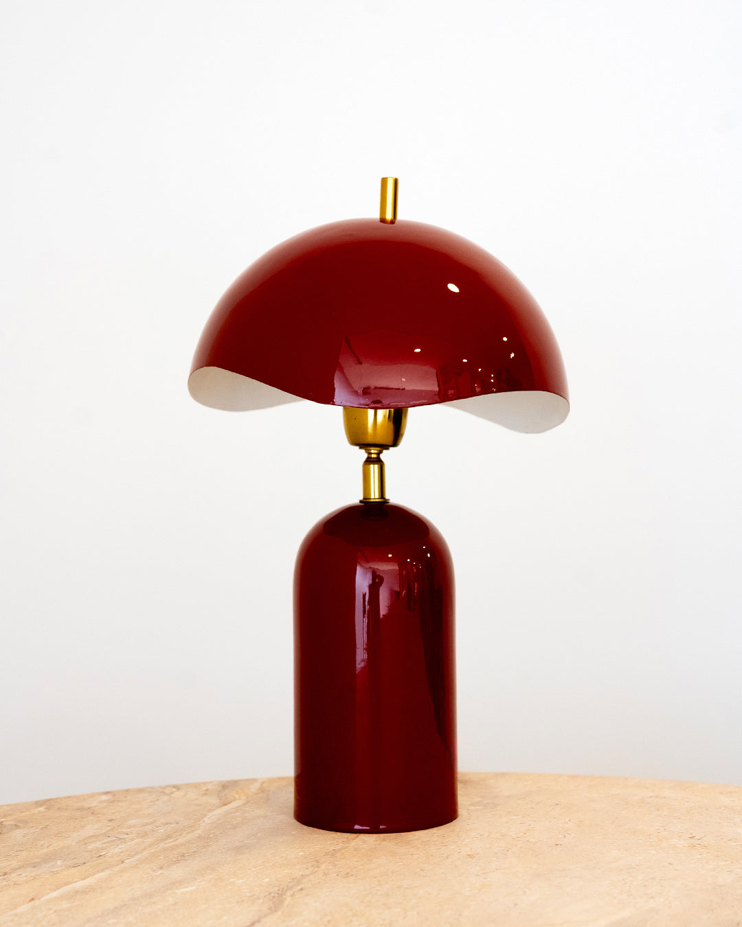Candeeiro de mesa em metal com acabamento esmaltado de cor bordeaux. Apresenta um design de linhas intemporais com o detalhe distintivo do abajur de rebordo ondulado.