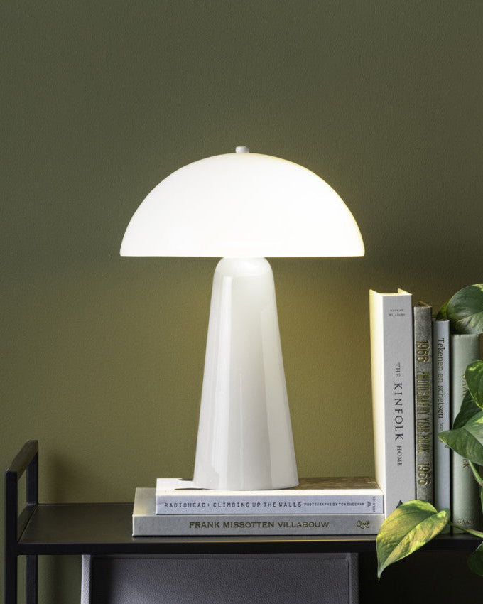 O vidro do abajur foi desenhado para difundir a luz de forma homogénea, eliminando o encadeamento e criando uma iluminação de ambiente tranquila. Com um diâmetro de 30 cm, é uma peça compacta mas com presença, adaptando-se facilmente a mesas de cabeceira ou zonas de leitura.