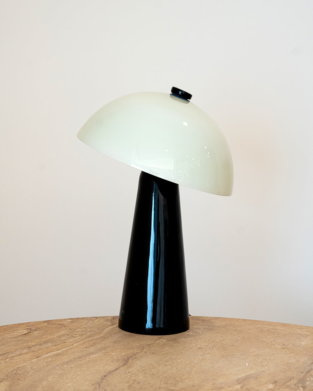 Candeeiro de mesa com base em metal de cor preta e abajur em vidro branco opalino. O contraste de materiais permite uma difusão de luz suave e homogénea.