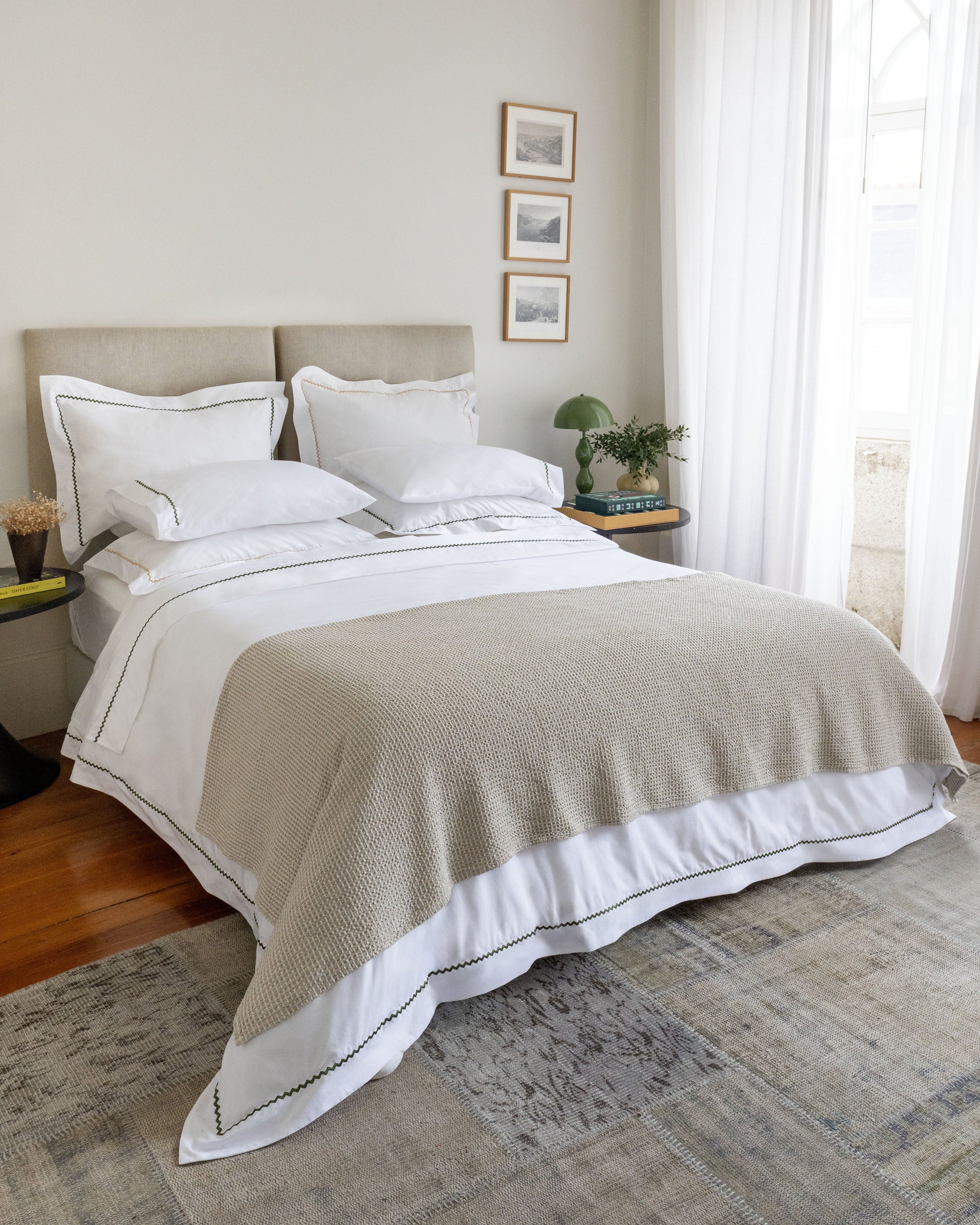 Capa de edredão 100% Algodão em Percal de 200 fios, produzido no norte de Portugal. Design liso com rebordo em zigzag bordado. Disponível em 5 cores.