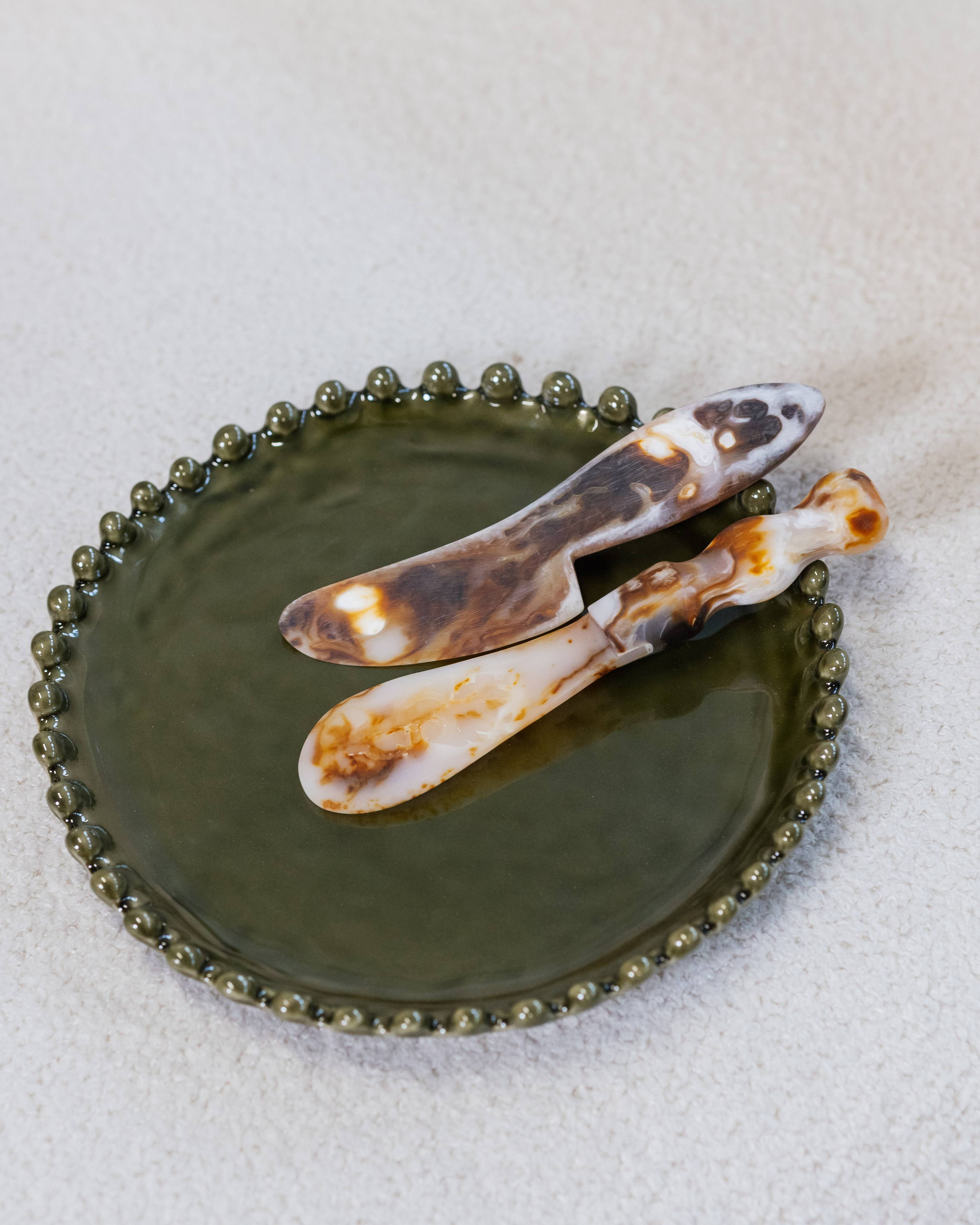 Conjunto de faquinhas em resina que complementam a mesa posta. Devido à natureza da resina, podem ocorrer variações de cor, tornando cada produto único.