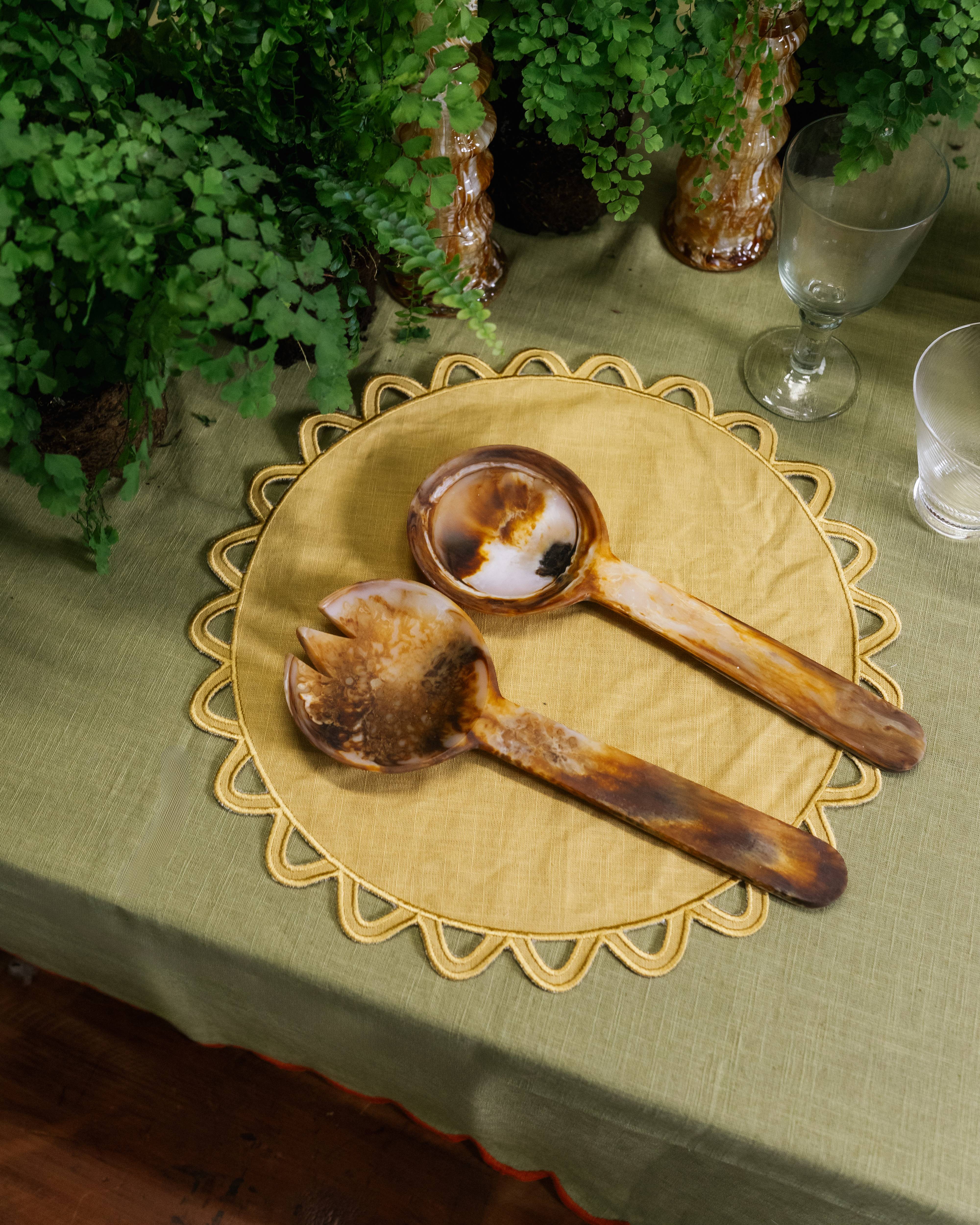 Conjunto de talheres em resina que complementam a mesa posta. Devido à natureza da resina, podem ocorrer variações de cor, tornando cada produto único.