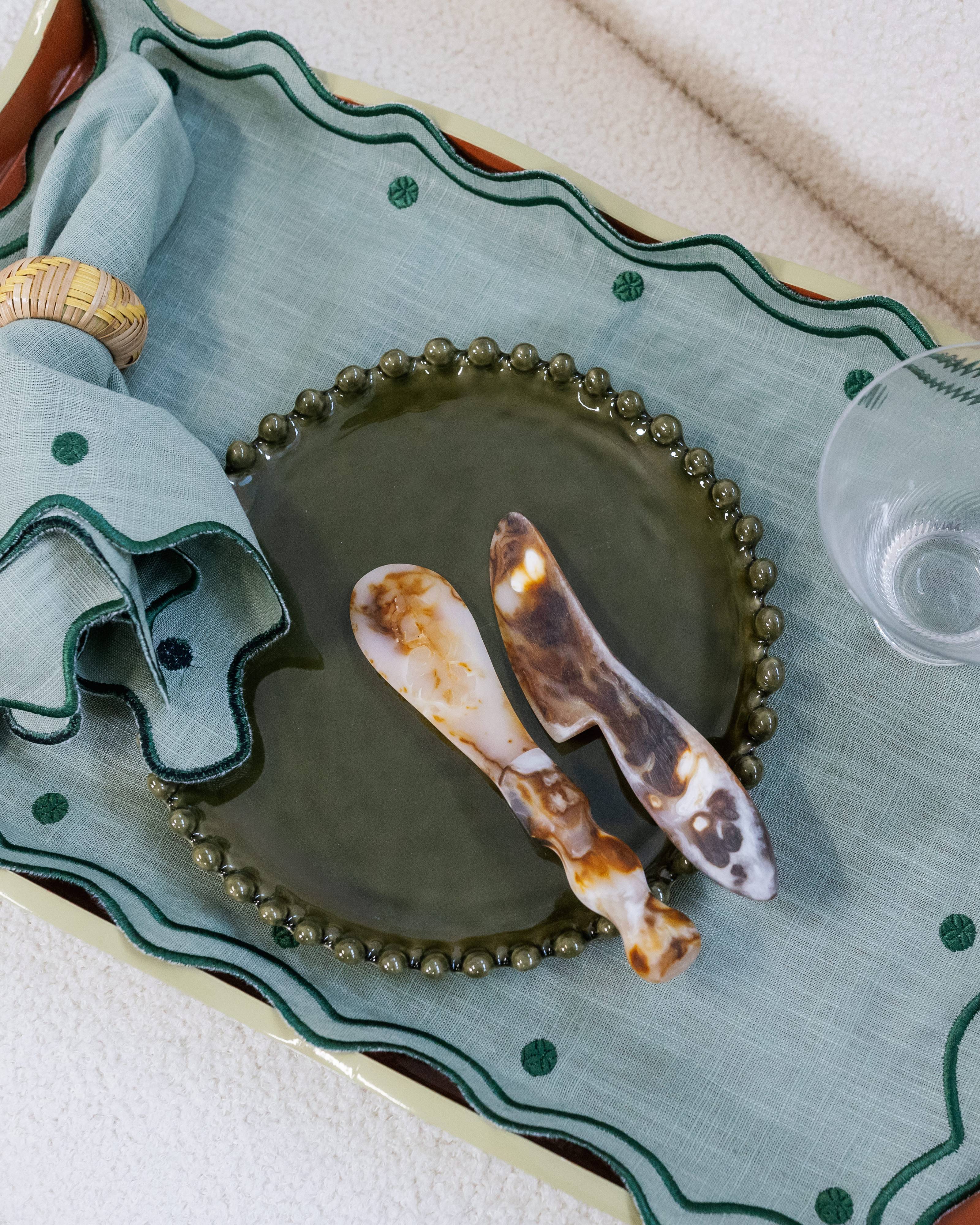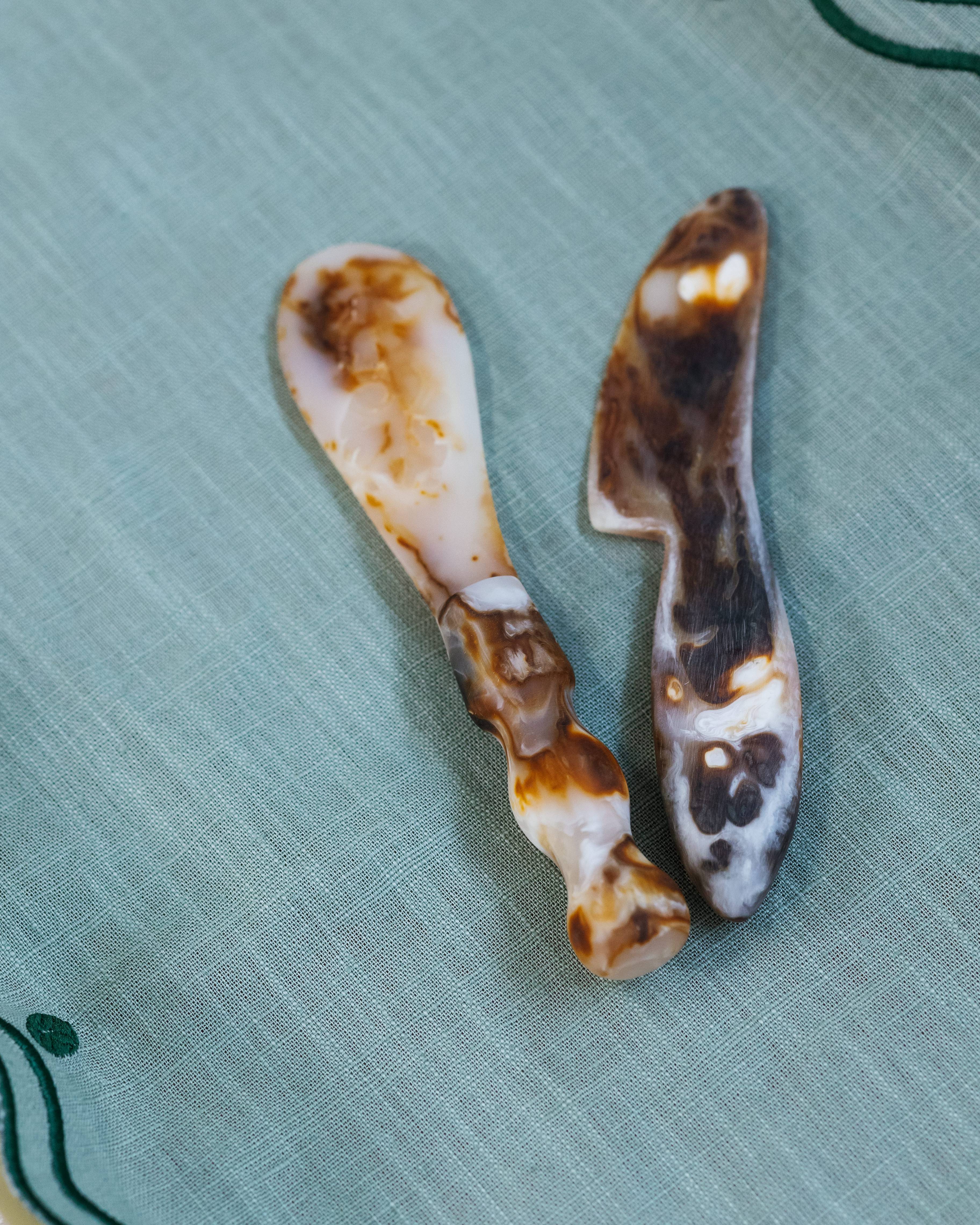 Faca para manteiga em resina que complementam a mesa posta. Devido à natureza da resina, podem ocorrer variações de cor, tornando cada produto único.