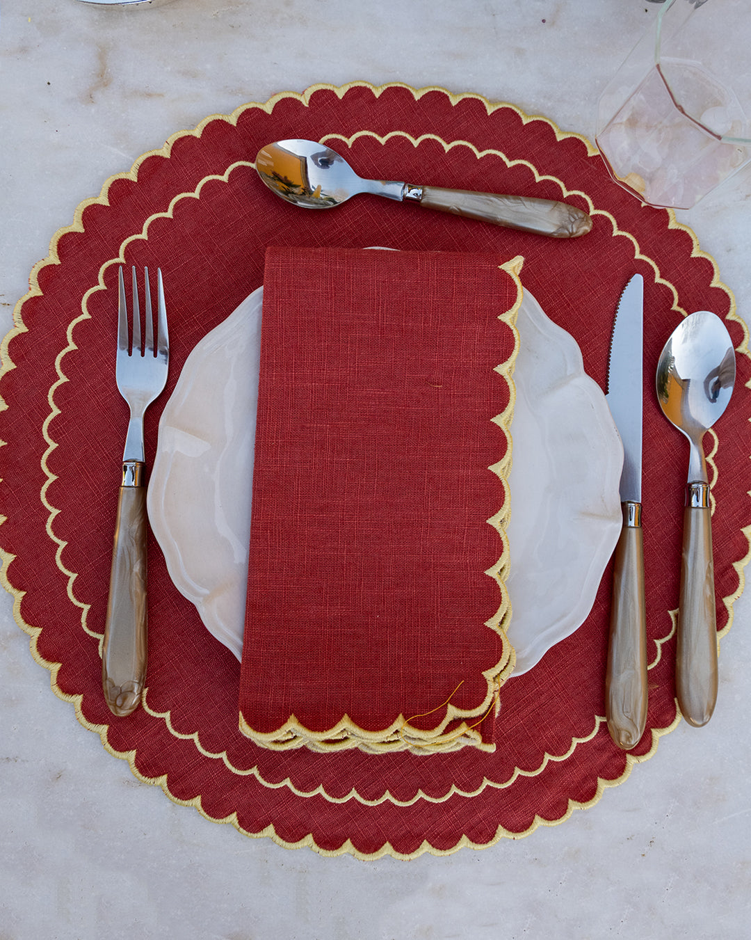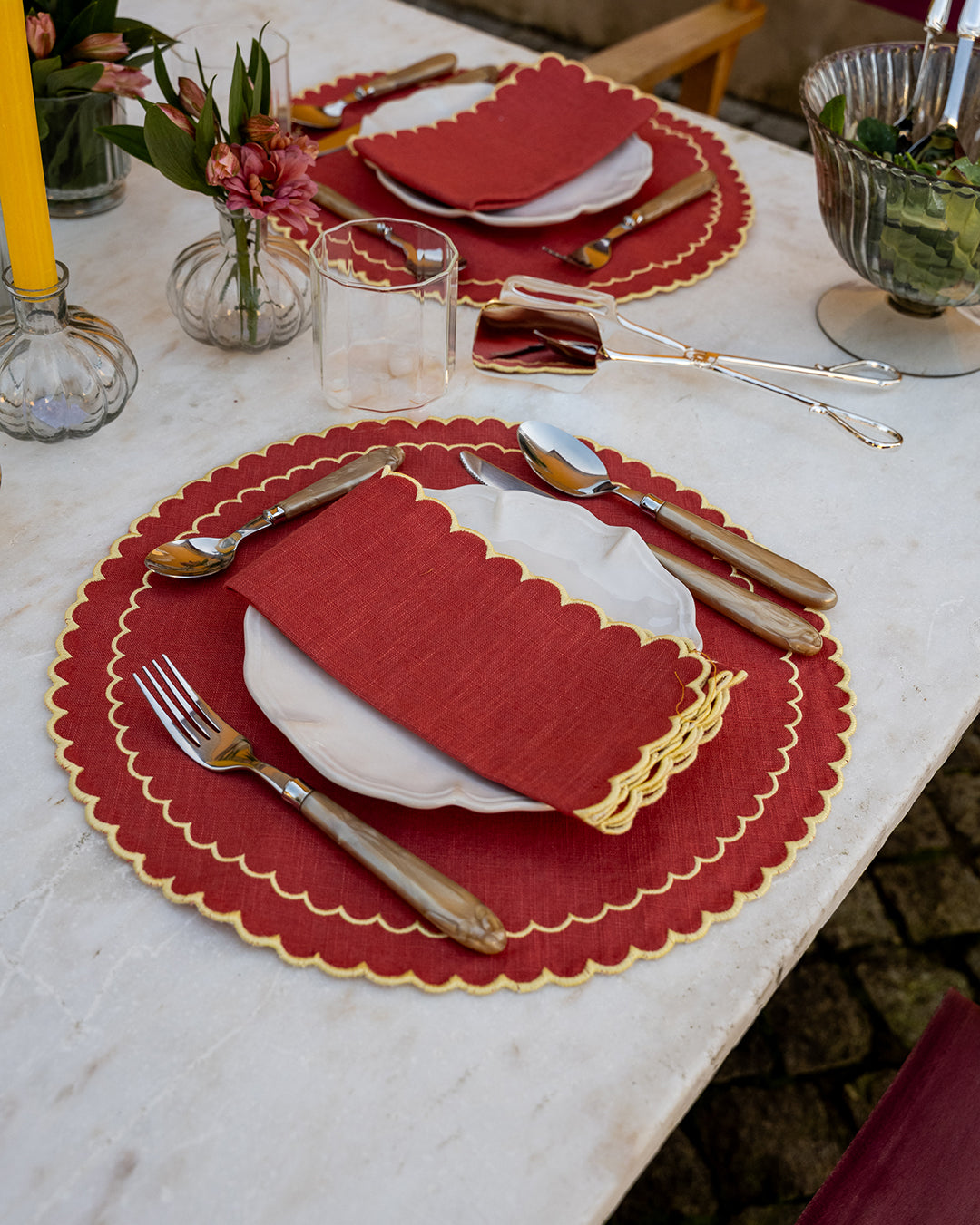 Guardanapo de quadrado. Apresenta um acabamento de rebordo ondulado em vieira (scallop).