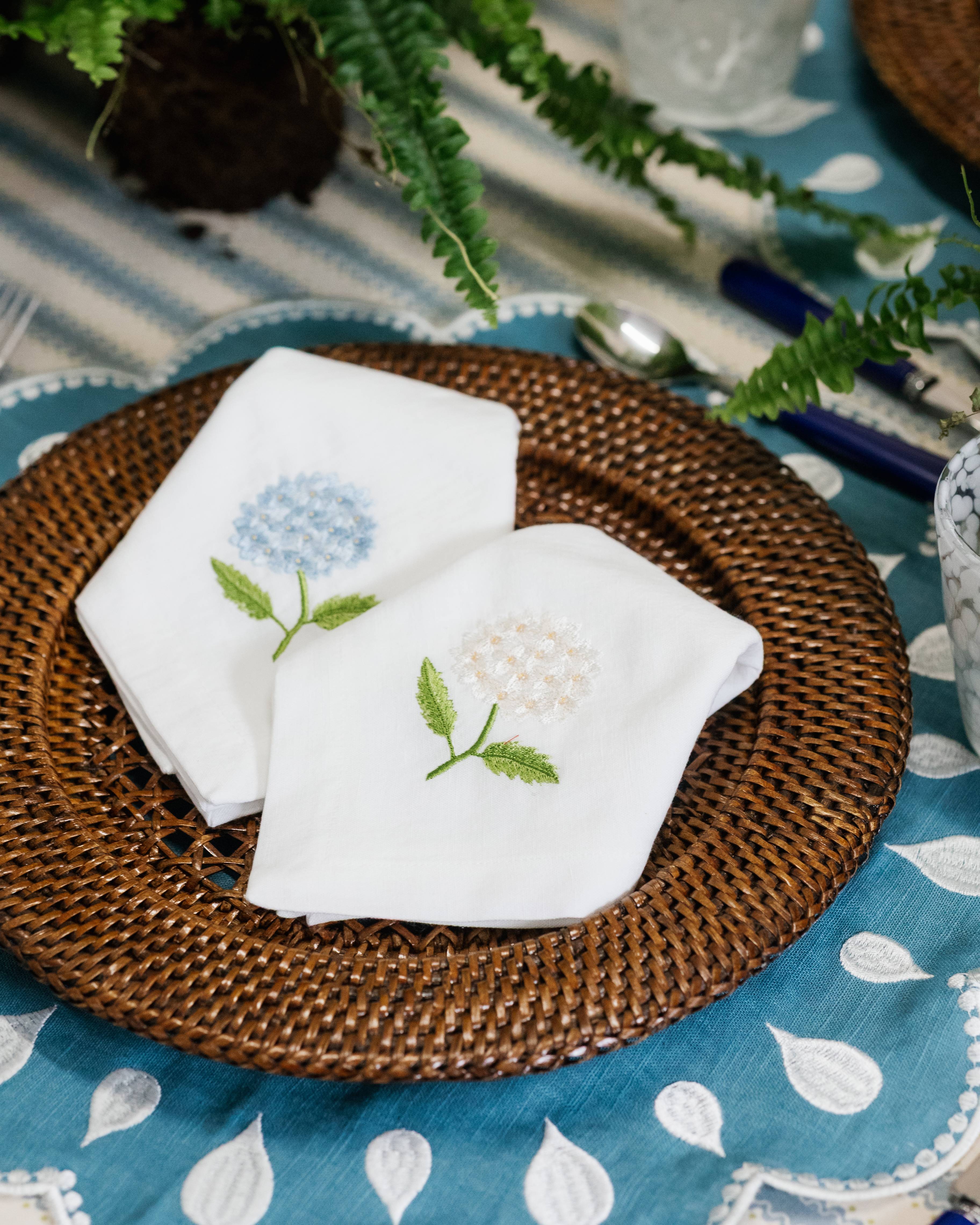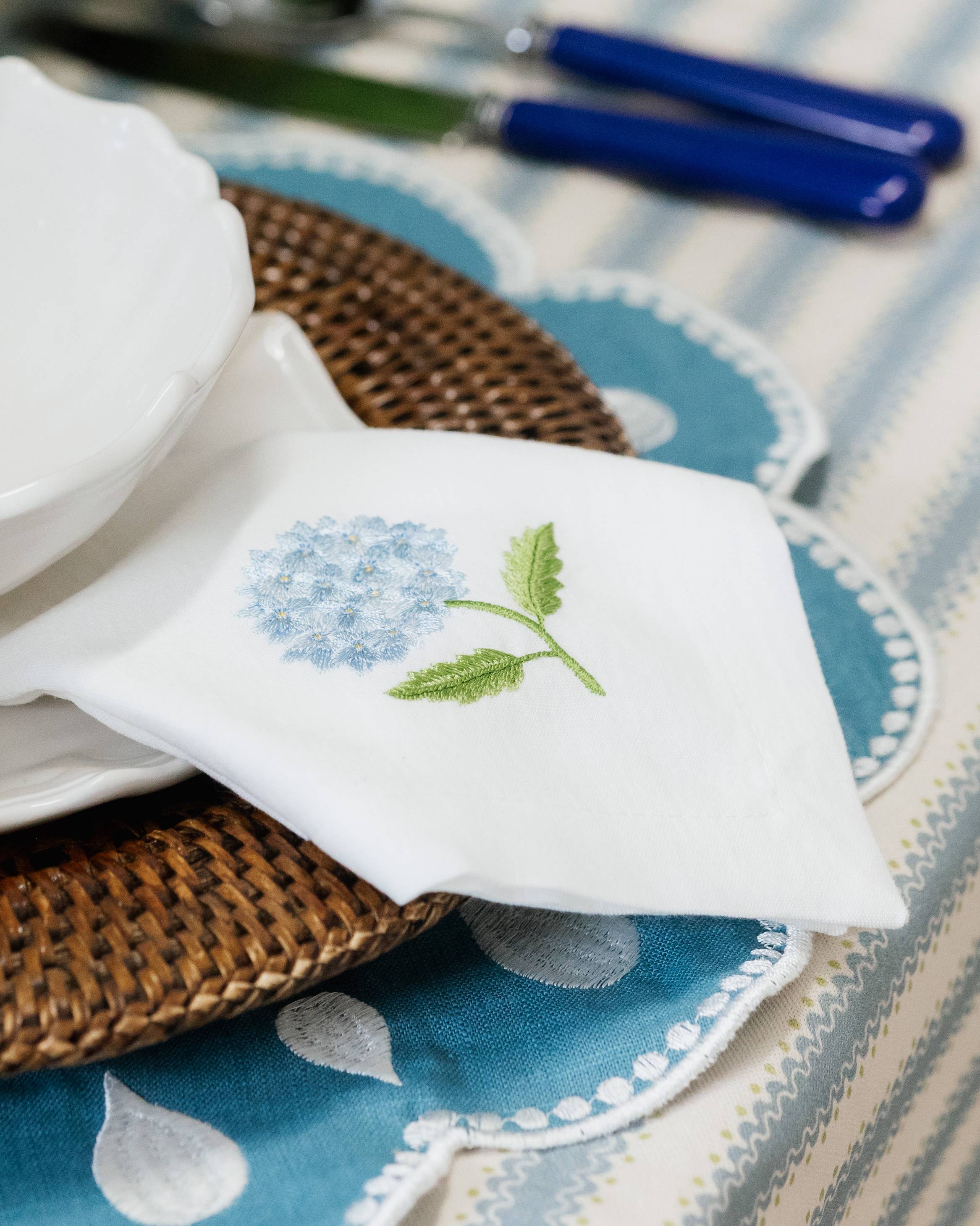 Guardanapo confeccionado em linho e algodão com bordado de hortênsia branca.