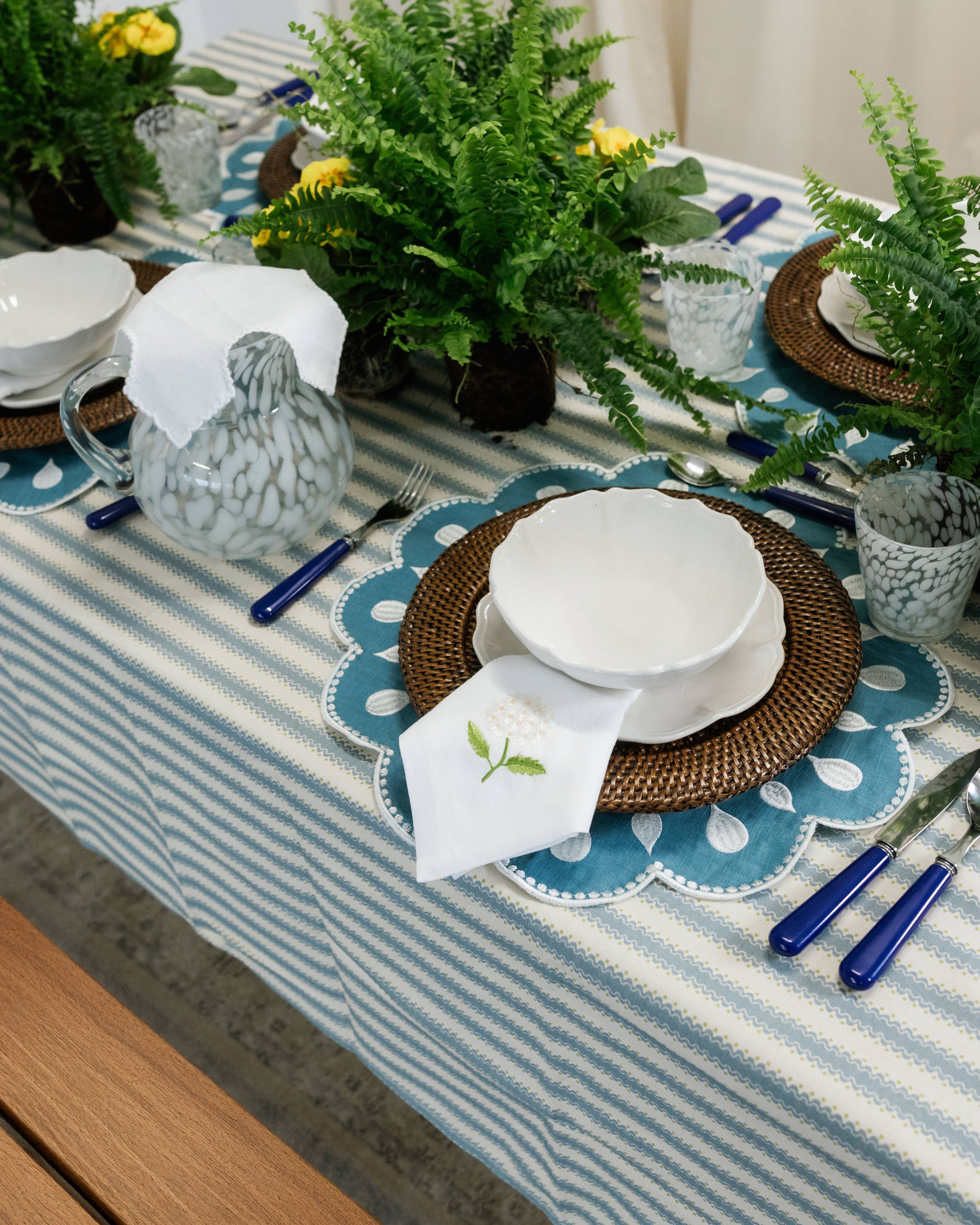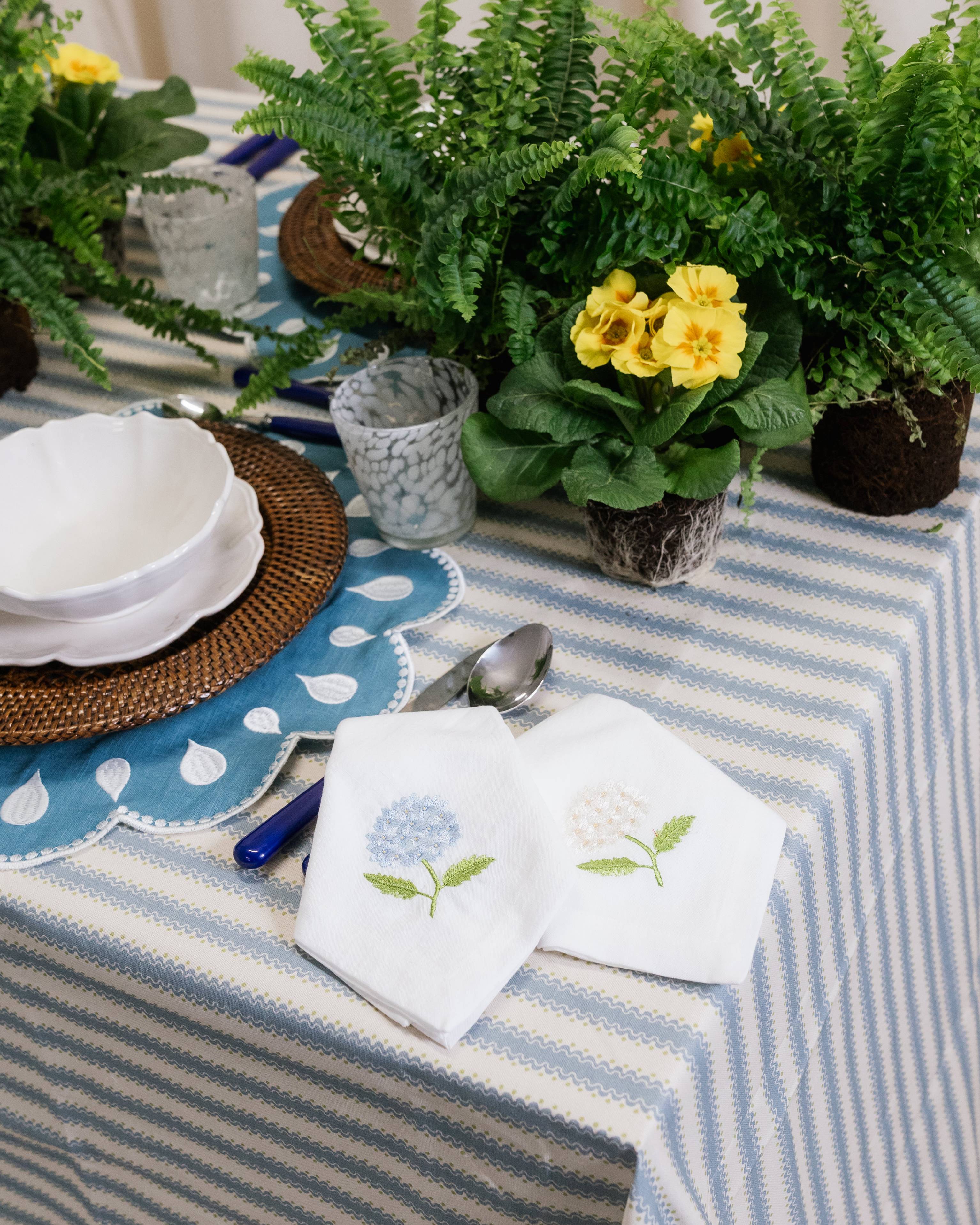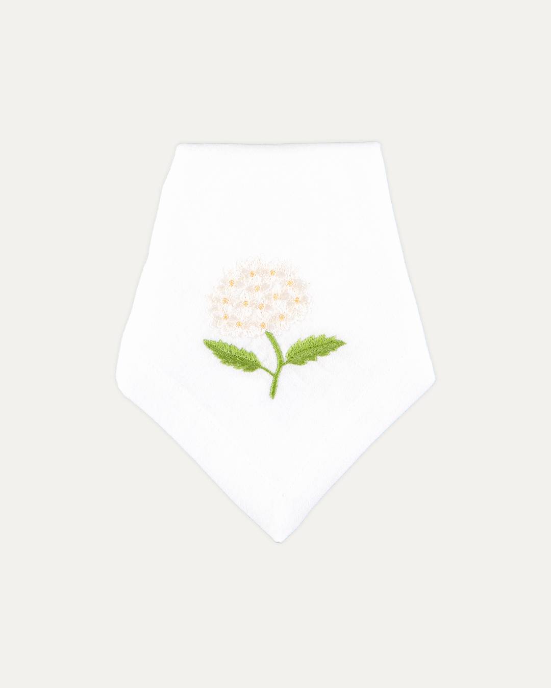 Guardanapo confeccionado em linho e algodão com bordado de hortênsia branca.