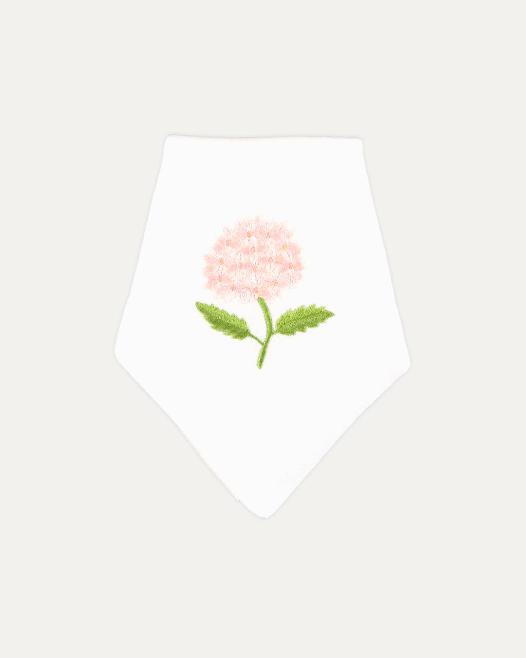 Guardanapo confeccionado em linho e algodão com bordado de hortênsia branca.