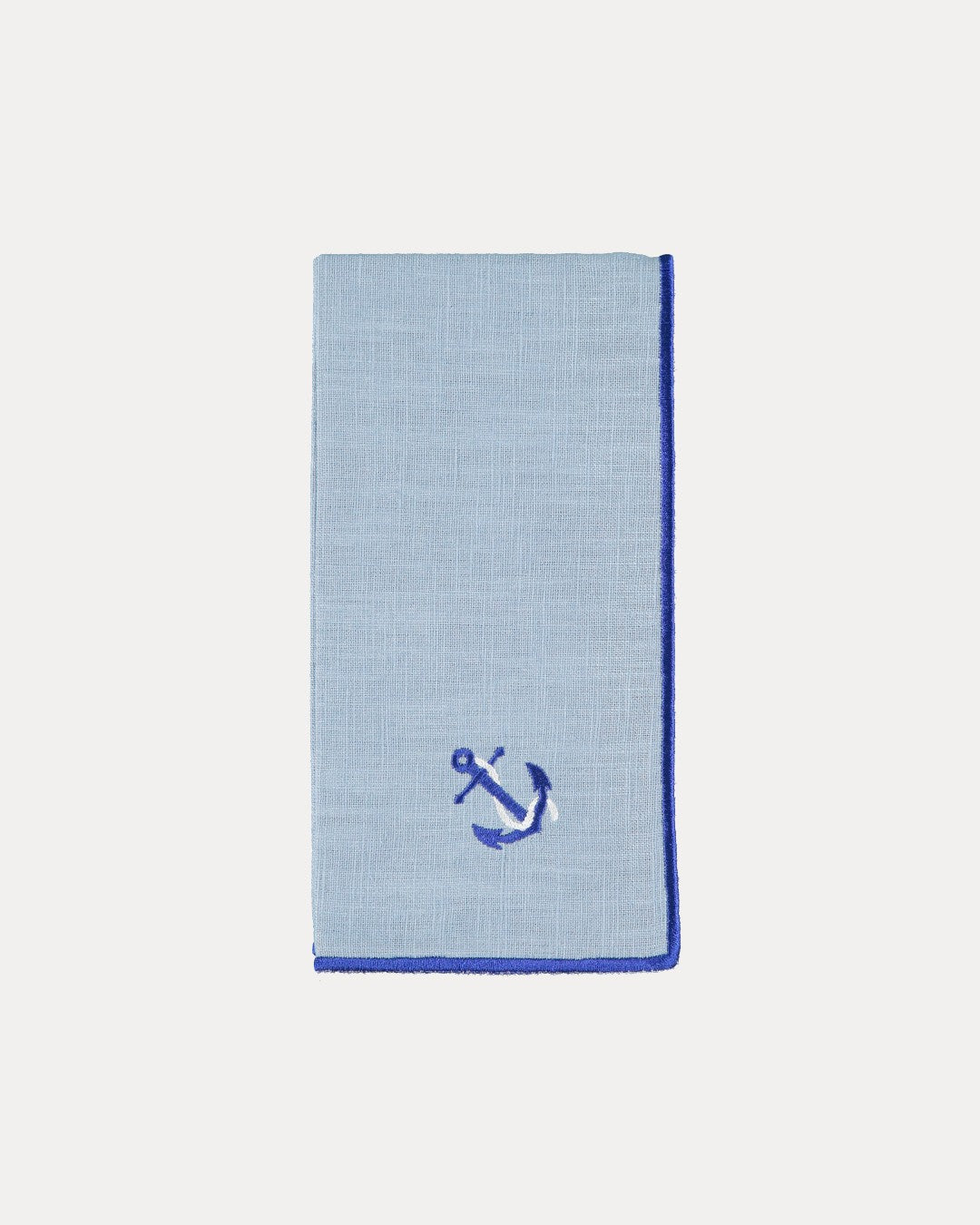 Guardanapo quadrado em mistura de linho e algodão azul, com pormenor contrastante de rolinho azul marinho. Disponível em quatro variantes de bordado: Âncora, Barco à Vela, Boia ou Lagosta.