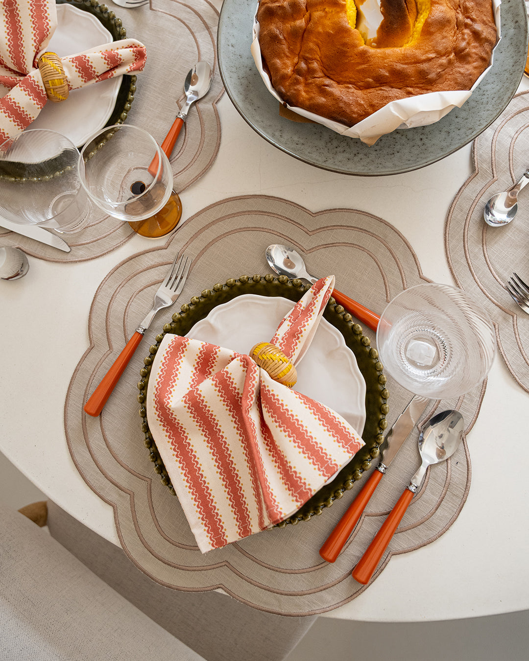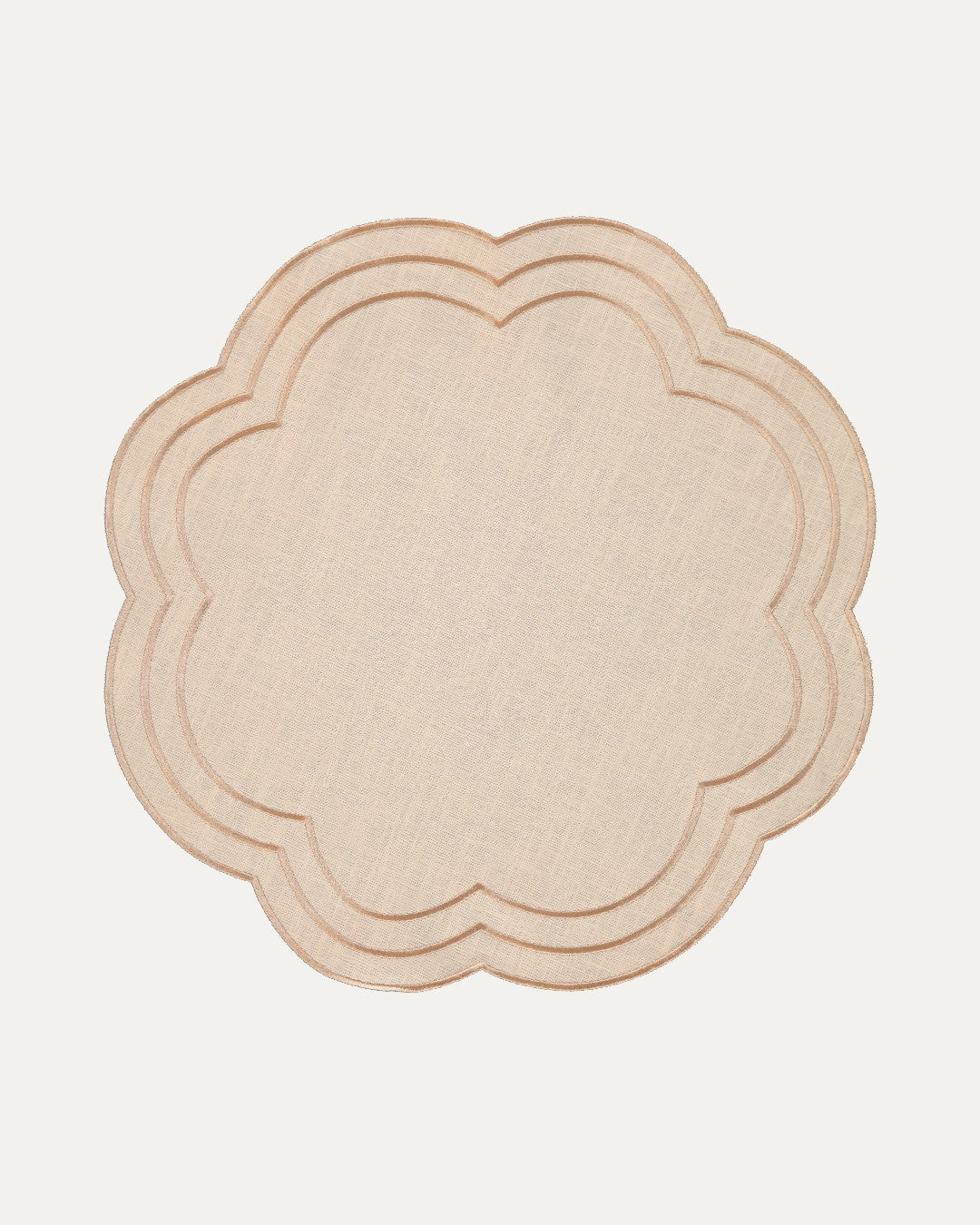 Individual de mesa com formato circular e rebordo ondulado com acabamento bordado. Design de inspiração orgânica que combina a textura natural das fibras com um detalhe decorativo clássico.
