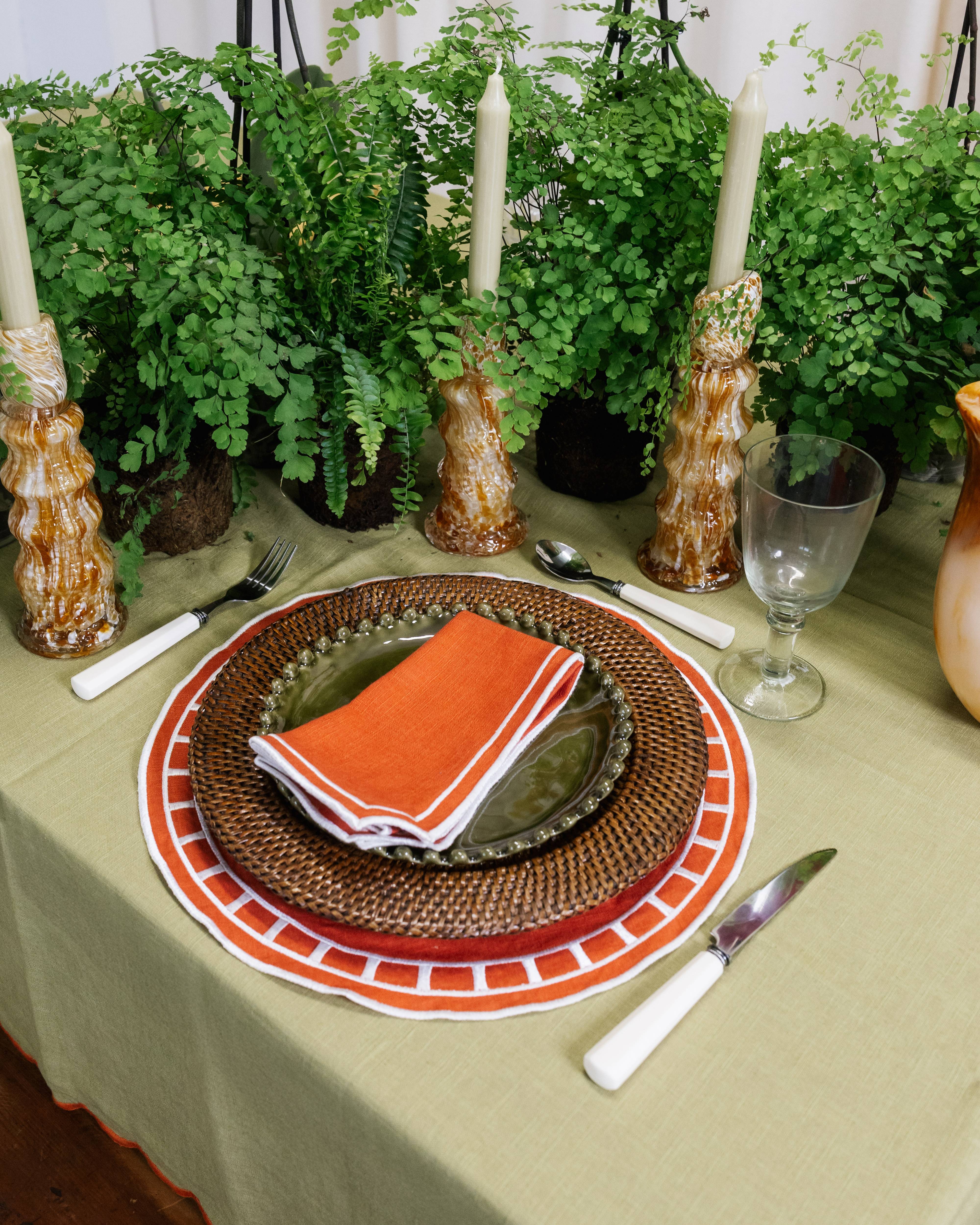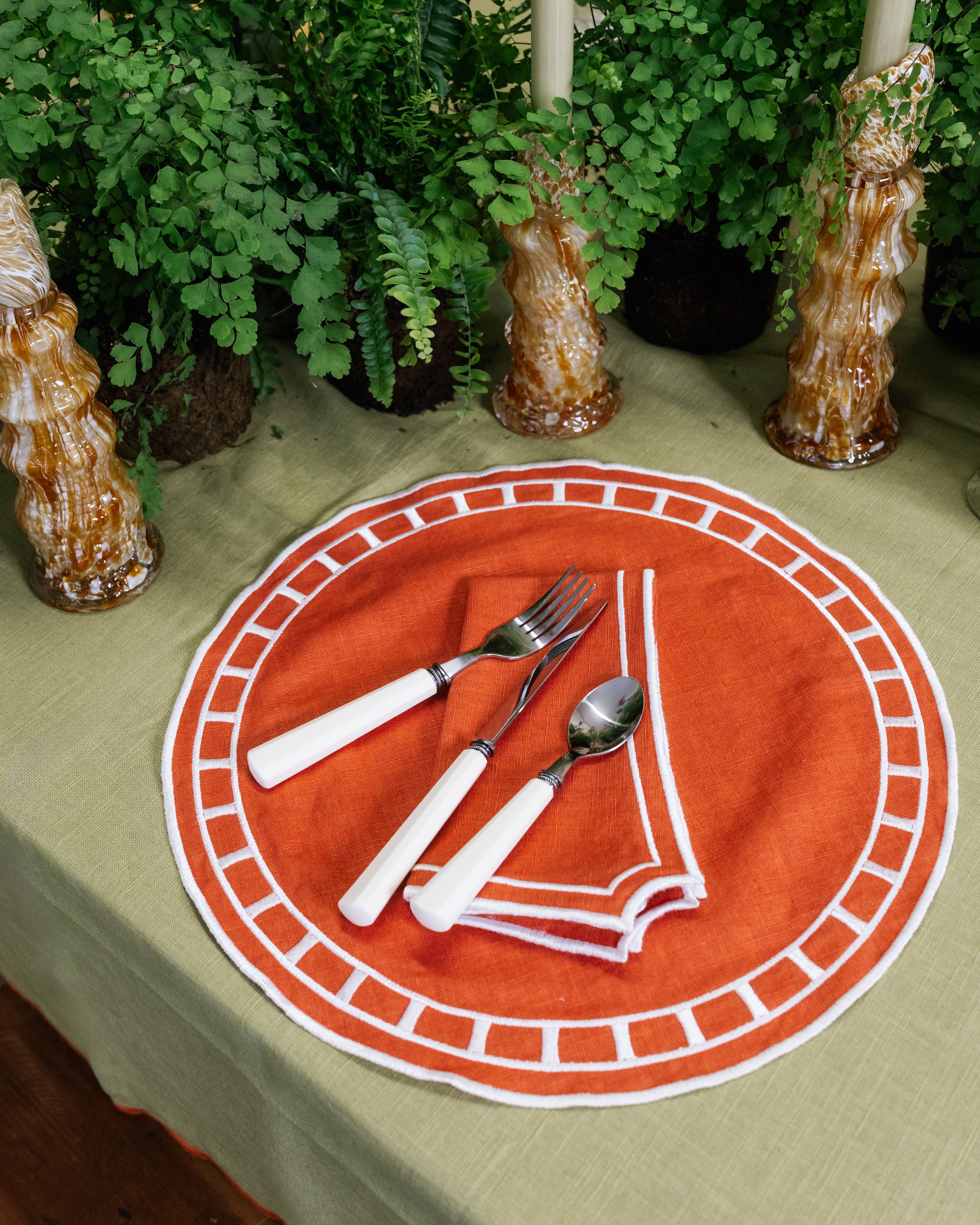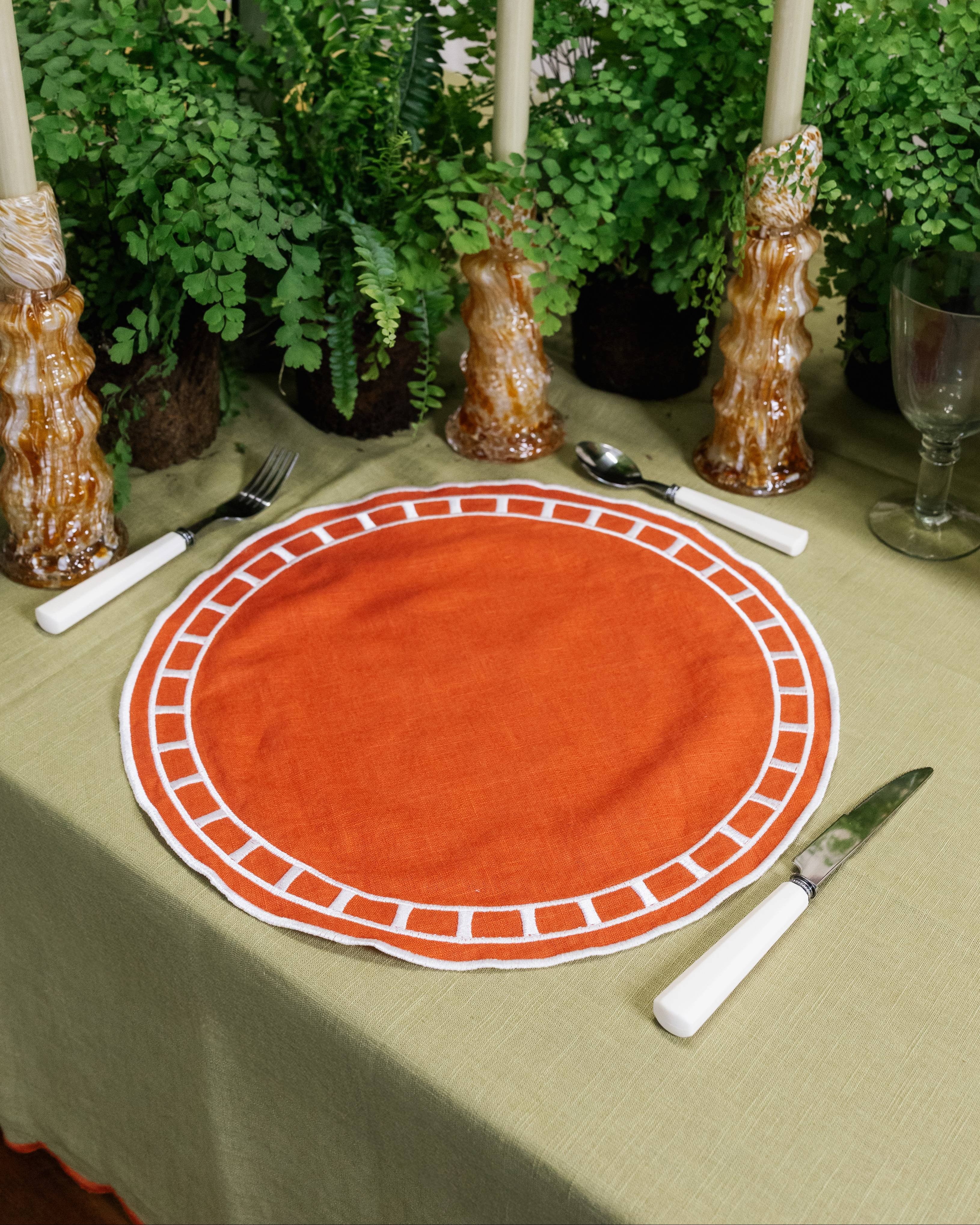 Individual confeccionado em linho e algodão com bordado decorativo na borda efeito mosaico.
